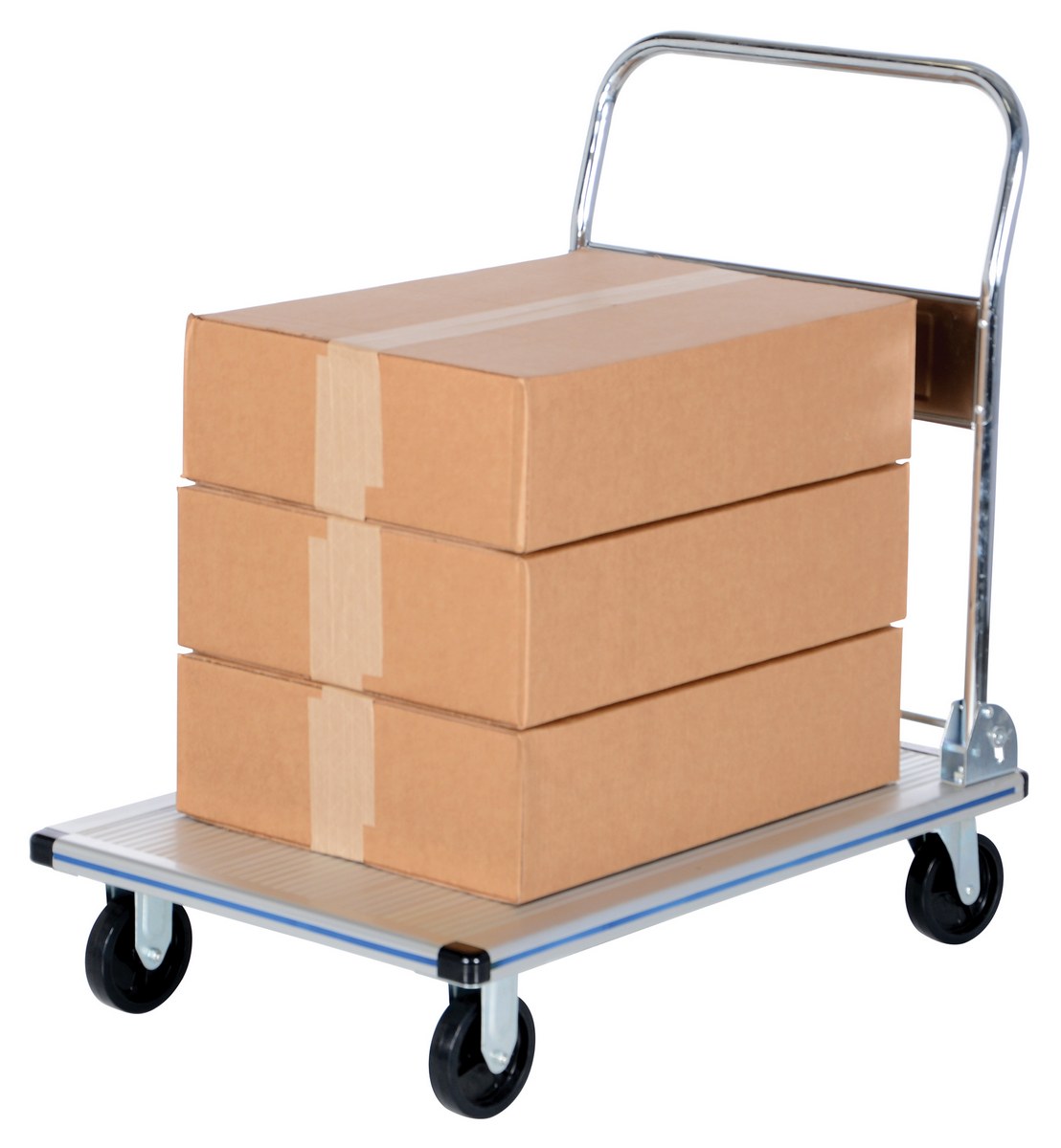 Aluminum Platform Truck With Polyurethane Casters 24 In. x 36 In. 600 Lb. Capacity SilverUse this Aluminum folding handle Platform Truck with non-marking casters for safe transportation of stacks of paper, small parts and other lightweight equipment. Ideal for maintenance rooms, offices, schools, hospitals, etc. Plastic corner protectors enhance durability and protect surroundings. The unit has a rugged aluminum construction with single handle design.