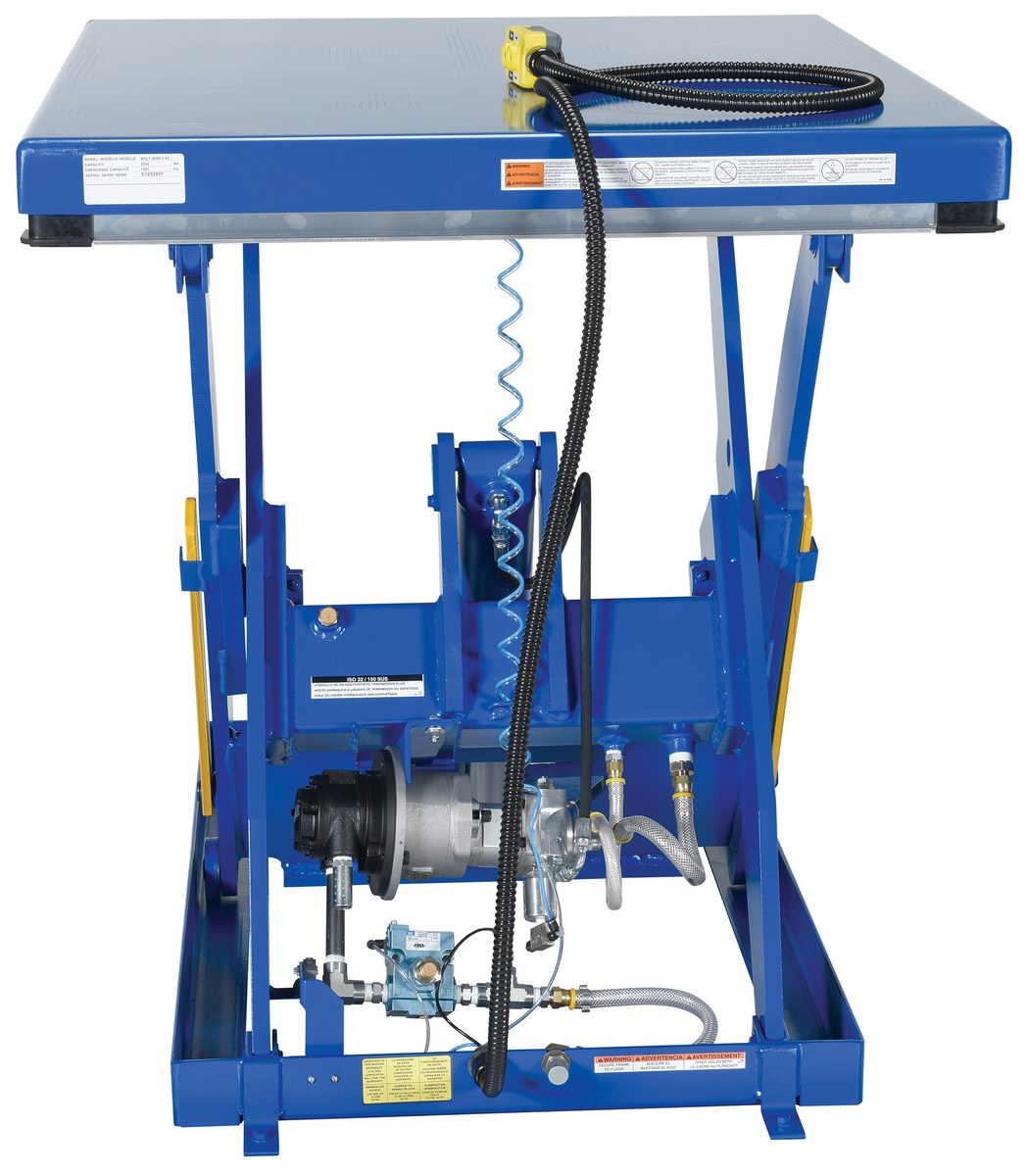 Steel Rotary Air Hydraulic Scissor Lift Table 40 In. x 48 In. 3,000 Lb. Capacity BlueThe rotary air/Hydraulic scissor lift table utilizes the convenience of factory air to power the lift table. Simply connect to an air supply through a filter, regulator, lubricator, and you will have a lift table suitable for a wide range of applications and operating environments. It features a pneumatic upper travel limit switch, safety toe guards, cylinder with internal safety velocity fuse, two button hand control, and life-time lubricated sleeve bearings.