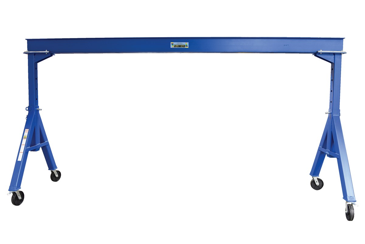 Steel Adjustable Height Gantry Crane with Phenolic Casters 15 Ft.Wide x 7 Ft. Max Usable Height 4,000 Lb. Capacity BlueThe industrial steel Gantry crane is designed for transporting and positioning materials along the beams length. The solid steel construction will provide years of service. Unit comes standard four (4) position locking swivel casters with roller bearings. Locks the rigging in 1 of 4 positions; you can set the wheels and push the gantry crane forward, back, left or right. There is an optional total locking casters that lock the rigging in any position and locks the wheel from rotating. More economical and flexible than permanent cranes and features a quick setup design. Painted blue finish with warning and operating stickers and complete owner's manual. Designed for semi-permanent or permanent applications. Requires assistance from fork truck to set-up.