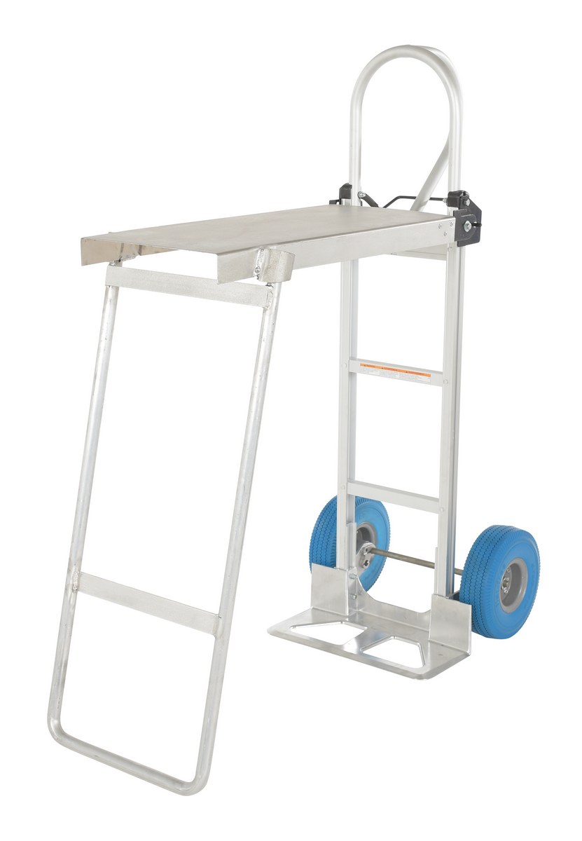This lightweight aluminum hand truck features an integral work bench. Work bench conveniently folds flat for storage. Now a sturdy work bench can be moved to where it is needed most. Provides for a more comfortable and ergonomically correct work position. P-handle design allows for easy maneuverability.