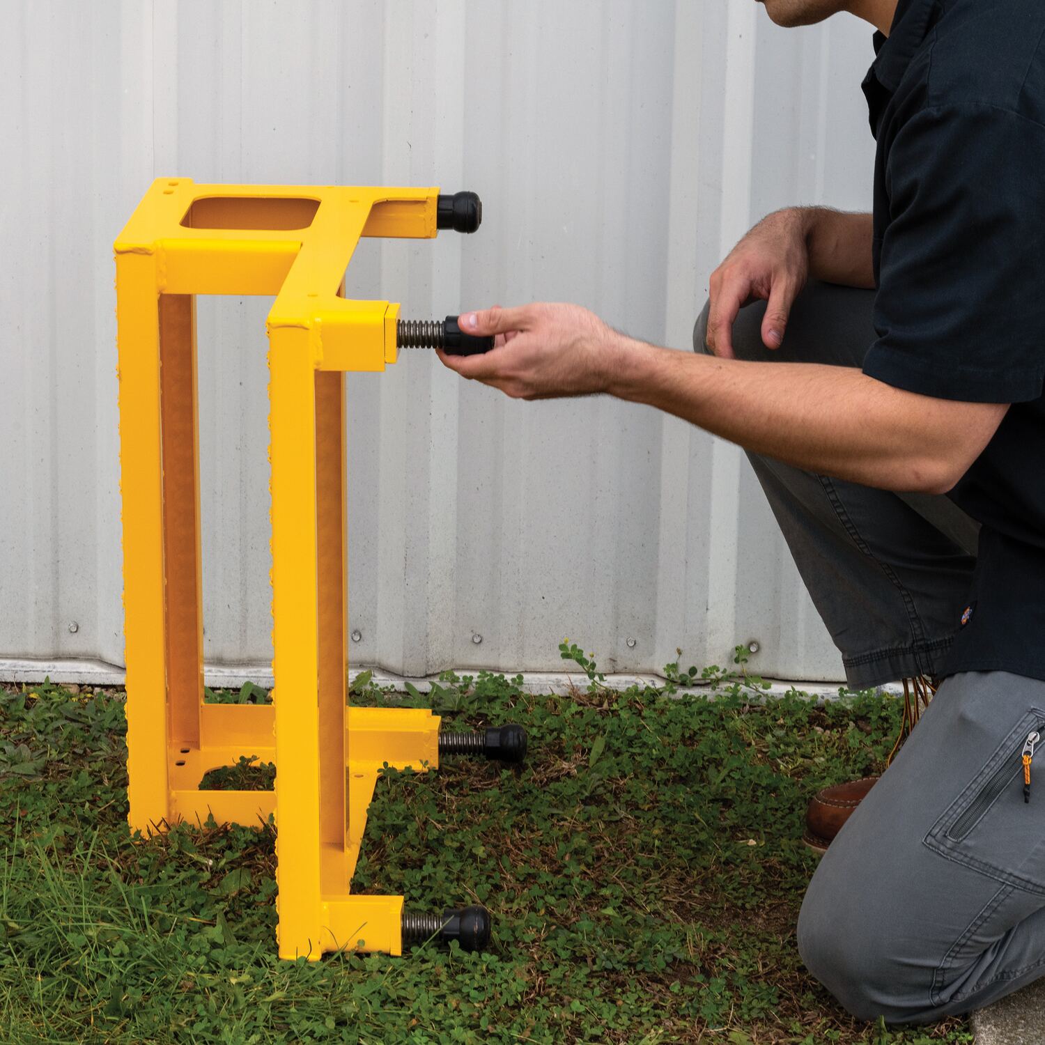 The adjustable step-mate stand can be used as either a comfortable worker platform or a semi-permanent step. The serrated surface ensures safe footing. The legs adjust individually by screwing them into or out of the leg base.