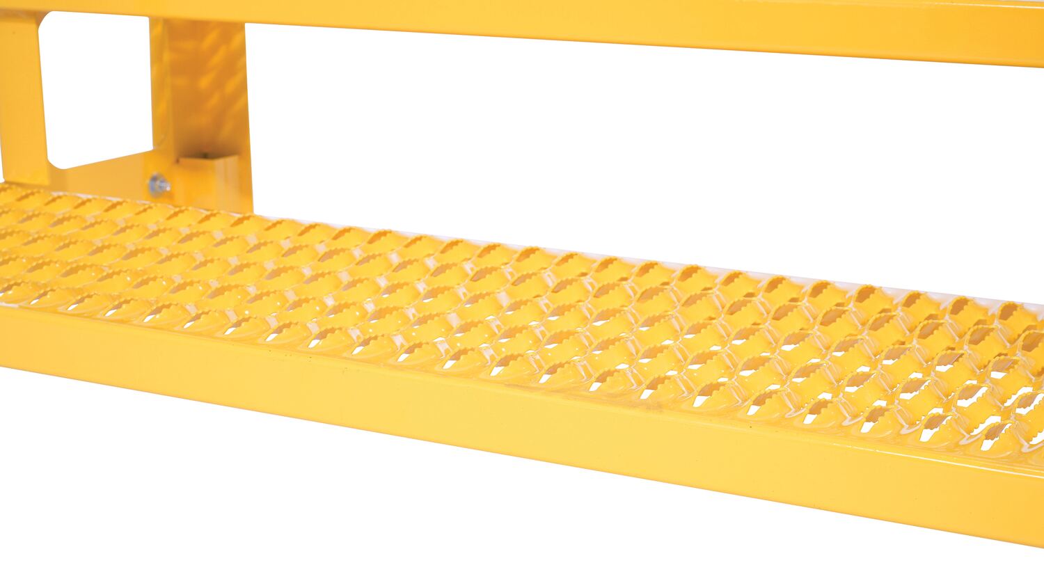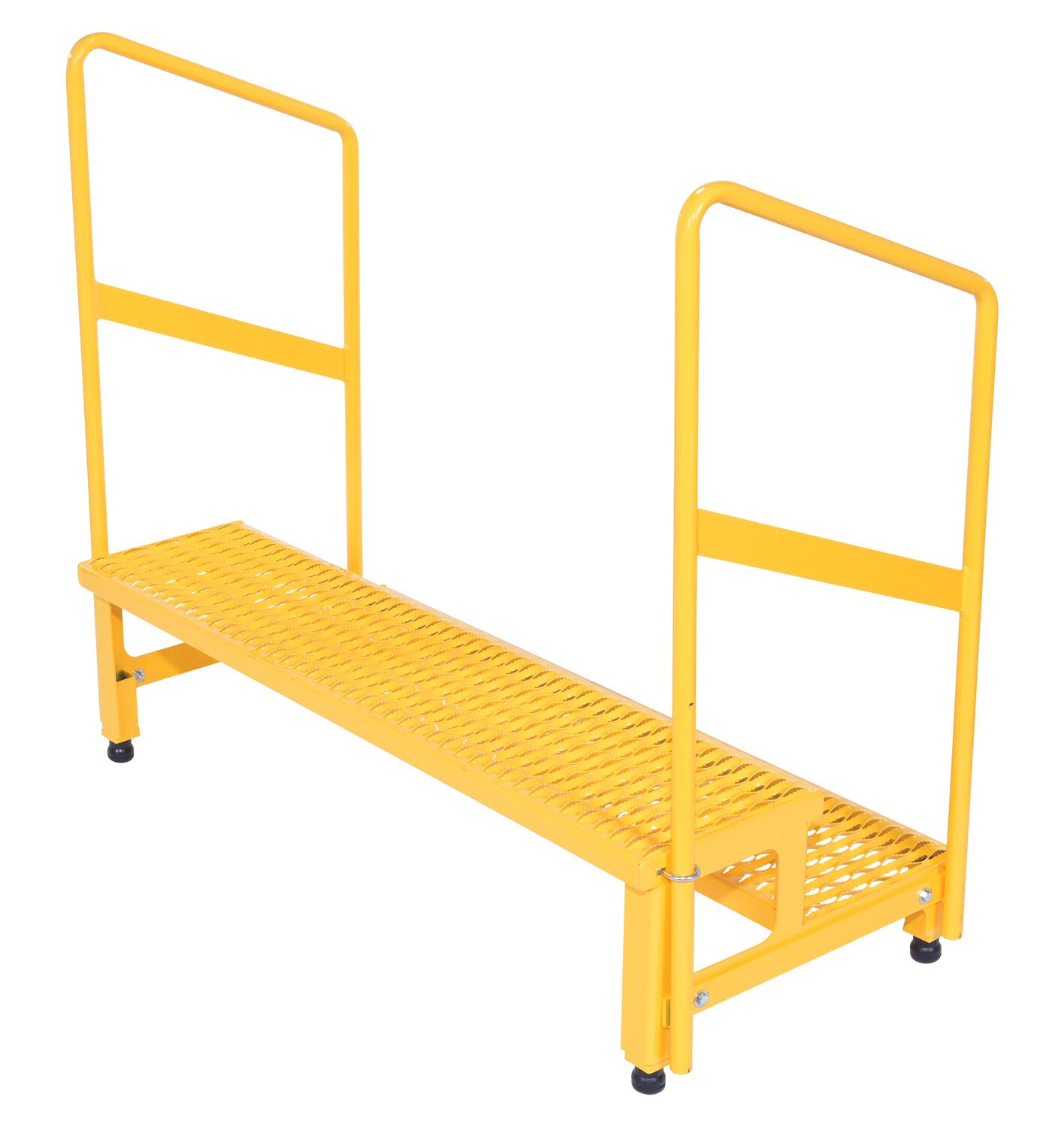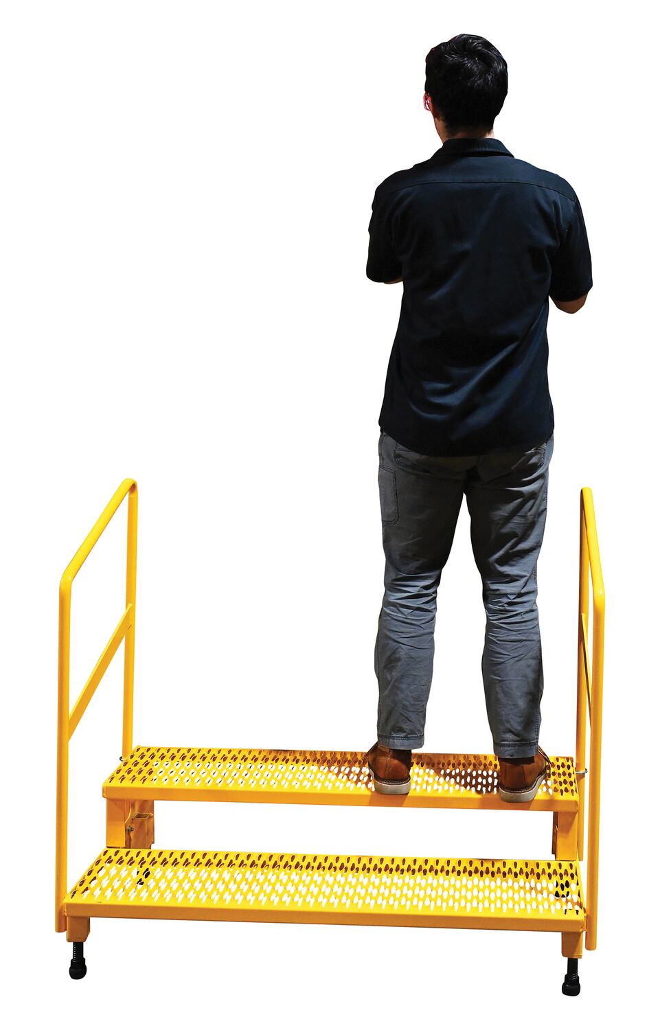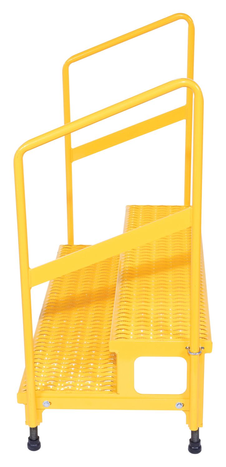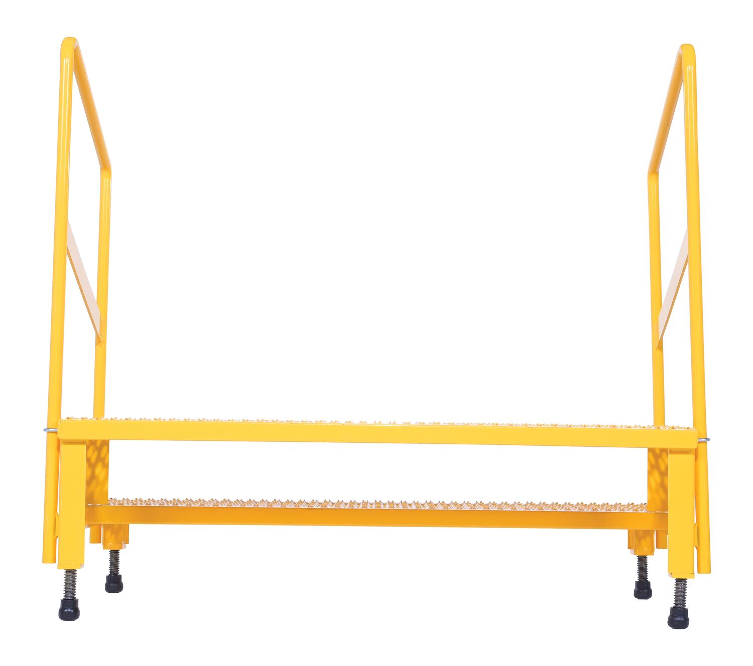 Steel Adjustable Step Mate Stand 2 Step with Handrails 22-7/8 In. x 50-1/2 In. x 43-1/8 In. 500 Lb. Capacity YellowThe adjustable step-mate stand can be used as either a comfortable worker platform or a semi-permanent step. The serrated surface ensures safe footing. The legs adjust individually by screwing them into or out of the leg base.