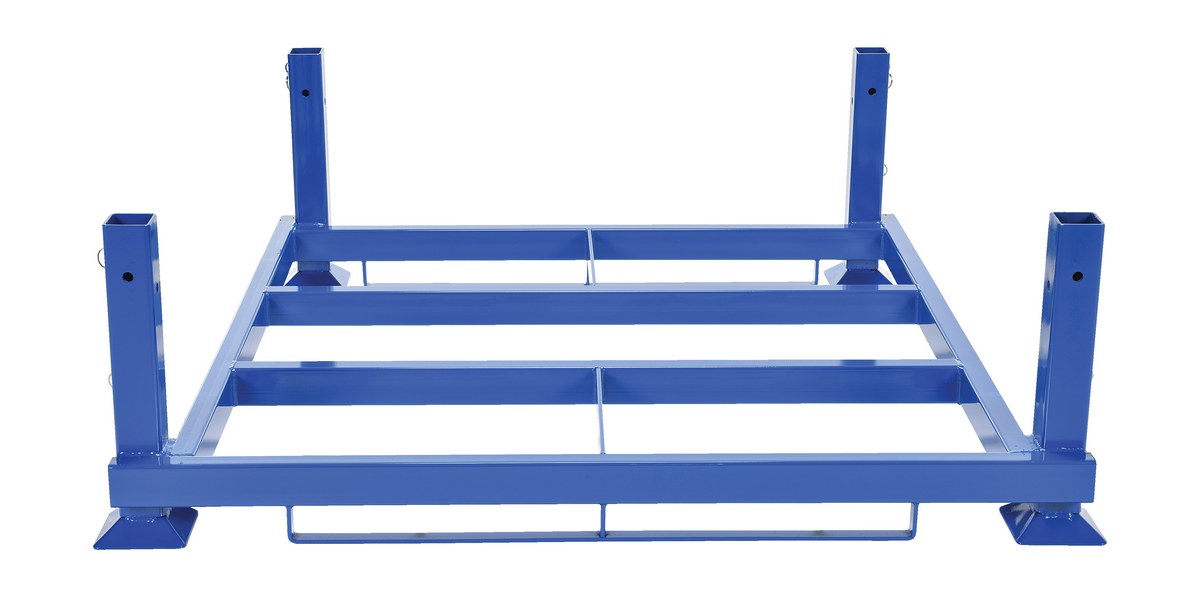 Steel Nestable Portable Rack Base 51-3/4 In. x 55-1/2 In. x 18 In. 4000 Lb. Capacity BluePortable stackable rack system a unique transport and storage rack that will stack and nest for maximum versatility. Change post height with removable posts. All heights noted are for load heights. Design allows for stacking up to two (2) units high. Large target and pintle for speedy alignment.