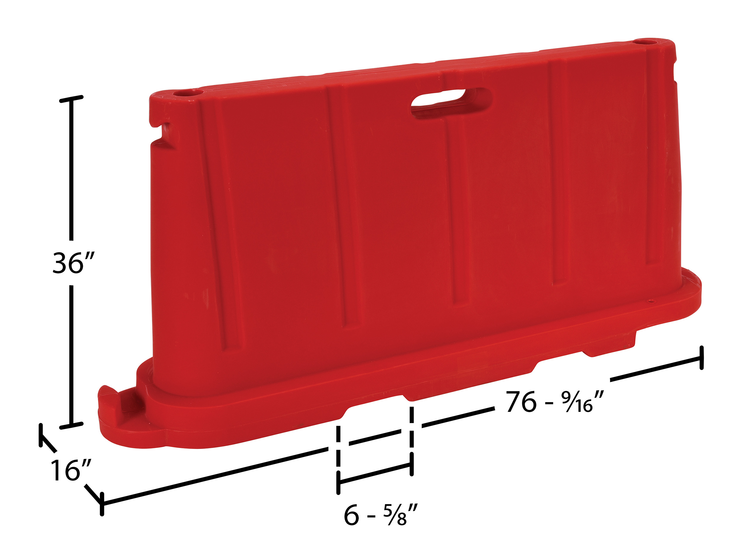 Polyethylene Stackable Barricade 76-1/2 In. x 16 In. x 36 In. RedThe portable barrier is ideal for traffic and crowd control. The unit can be filled with water or sand for added security. The barriers have additional forklift slots on the bottom of the unit for easy transportation and can be stacked during storage for extra space. Special colors and custom mold in graphic labeling is available upon request.