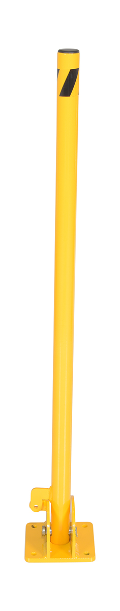 Steel Fold-Down Galvanized Bollard 42 In. YellowFolding steel barrier post for parking control and security. This folding bollard is locked in the raised position with a padlock (padlock not included). When padlock is removed, bollard may be lowered to ground to allow for access. Base plate must be lagged to ground for proper installation (installation hardware not included). Steel construction.