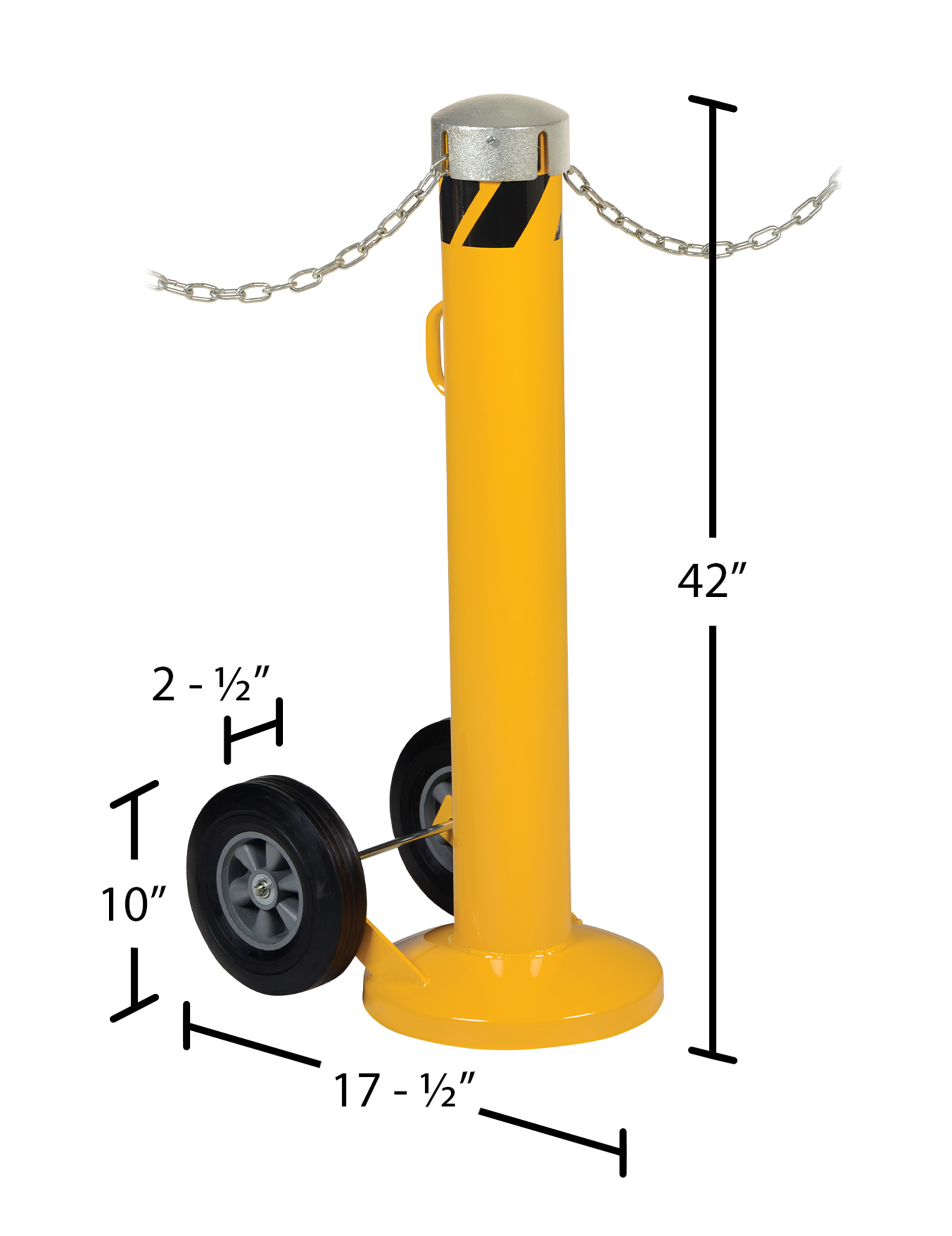Steel Movable Bollard with Wheels, Removable Bolt-On Steel Cap and Slots 42 In. x 5-1/2 In. YellowThe movable bollard with chain slots provides a portable visual barrier when an area needs temporary protection. Create barriers around workstations, machinery, and outdoor spaces by placing chain into chain slots, storing any excess chain inside the bollard, and placing the cap back onto bollard. The chain slots hold chain connected to other bollards. Ideal for use when keeping traffic out of a temporarily hazardous area or area under repair. Can be used indoors or outdoors. Powder coated yellow for high visibility.