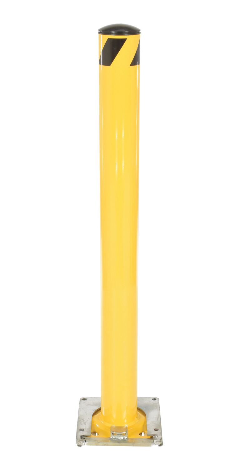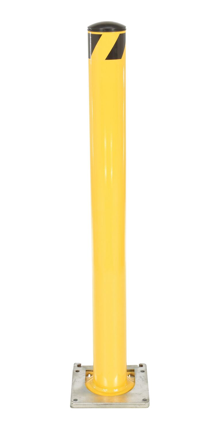 Steel Surface Mounted Removable Pipe Safety Bollard 48 In. x 4-1/2 In. YellowThis steel pipe safety bollard can be used both indoors and outdoors to protect work areas, racking and personnel. Surface mounted steel base plate allows for quick and easy bollard removal. Steel base plate is bolted in place. Guard is easily inserted into base plate then locked in place. Base plate includes pre-drilled mounting holes. Plastic caps are removable. Powder coated safety yellow finish. Welded steel construction.