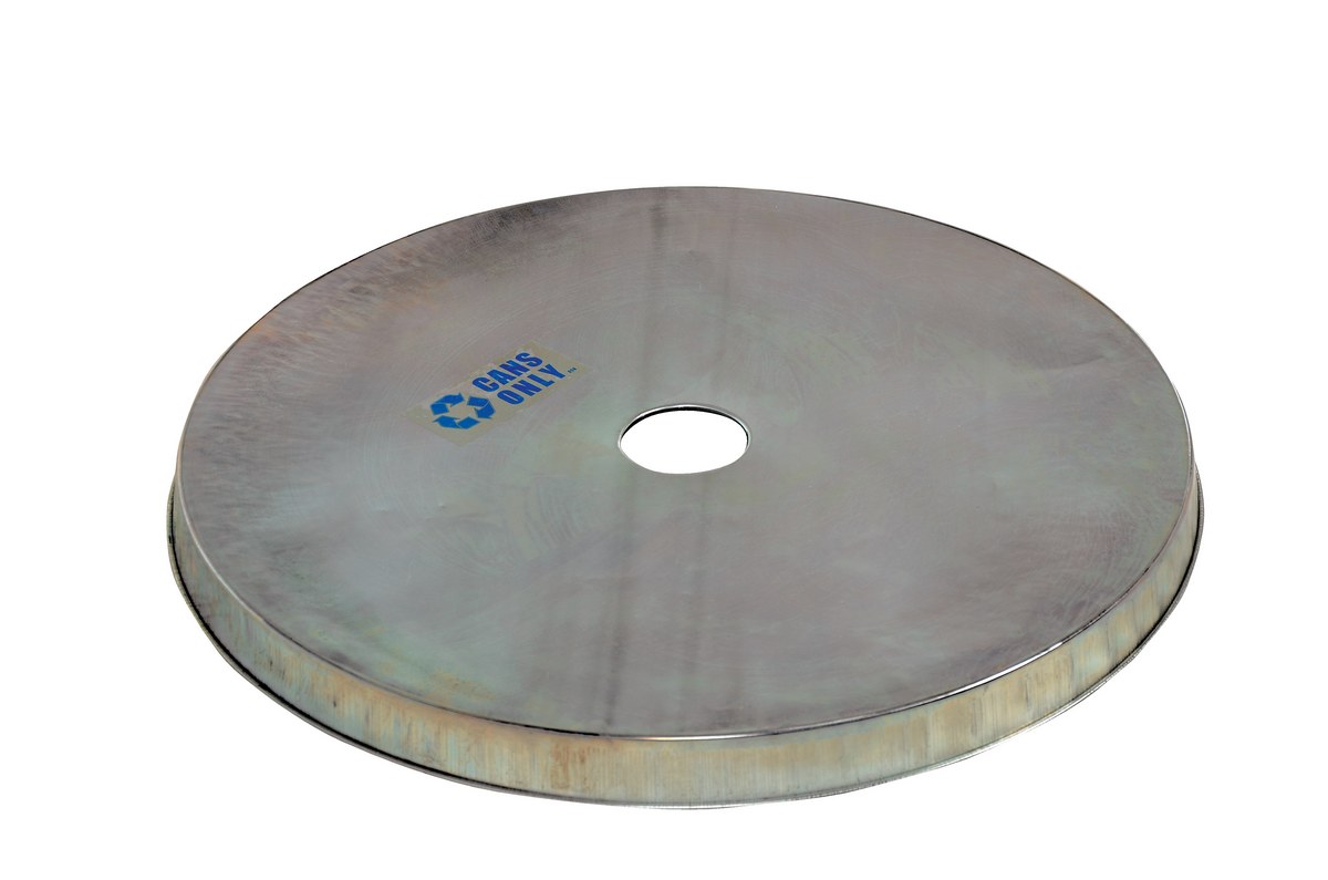 Galvanized Open Head Drum Cover Disposal Hole SilverThis Galvanized steel drum cover is for a fifty-five (55) gallon open head (tight head) drum. Manufactured from galvanized steel. Cover drum tops for added protection. Perimeter rim is beaded for safety. Recycling top includes a "cans only" decal.