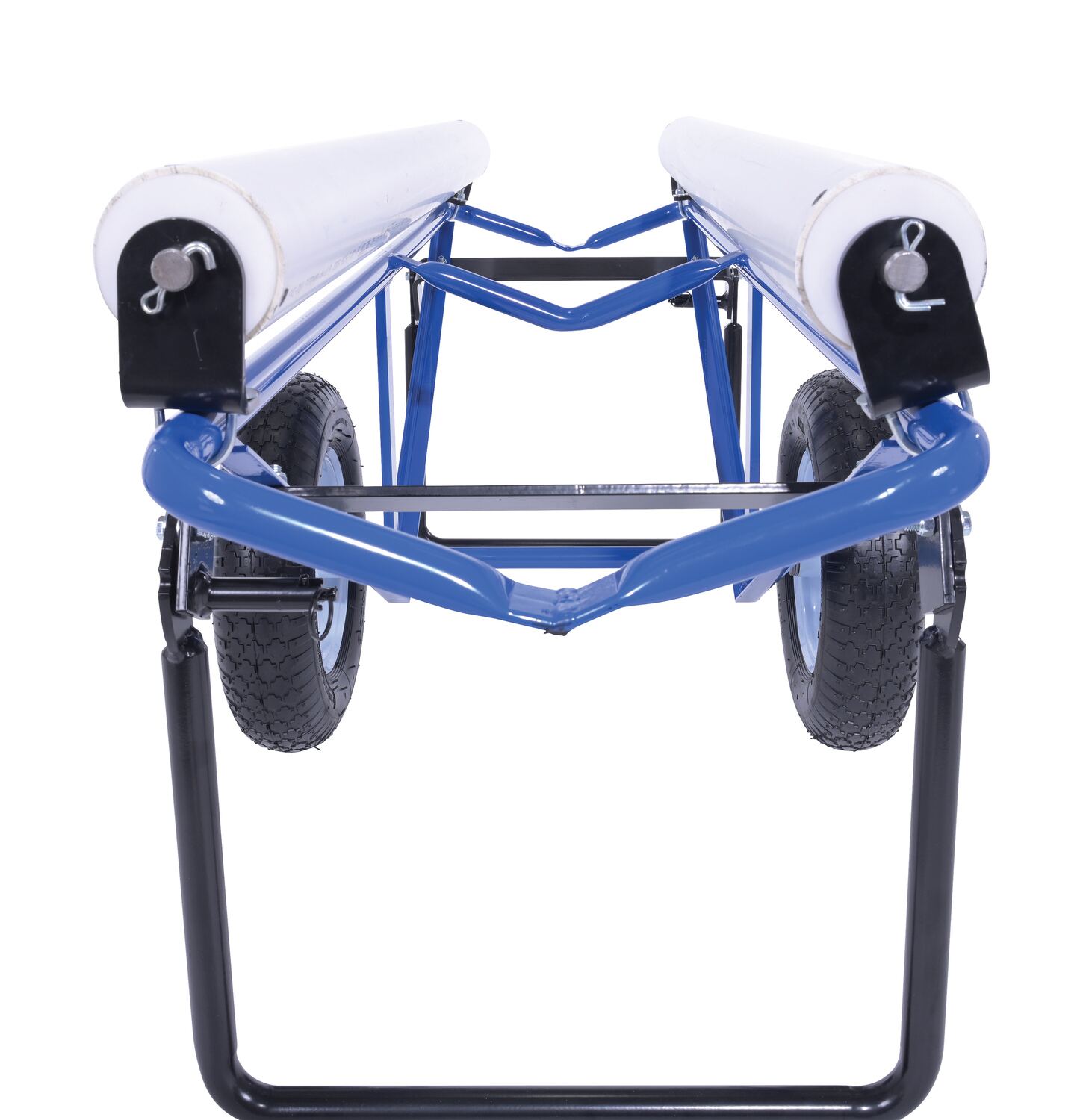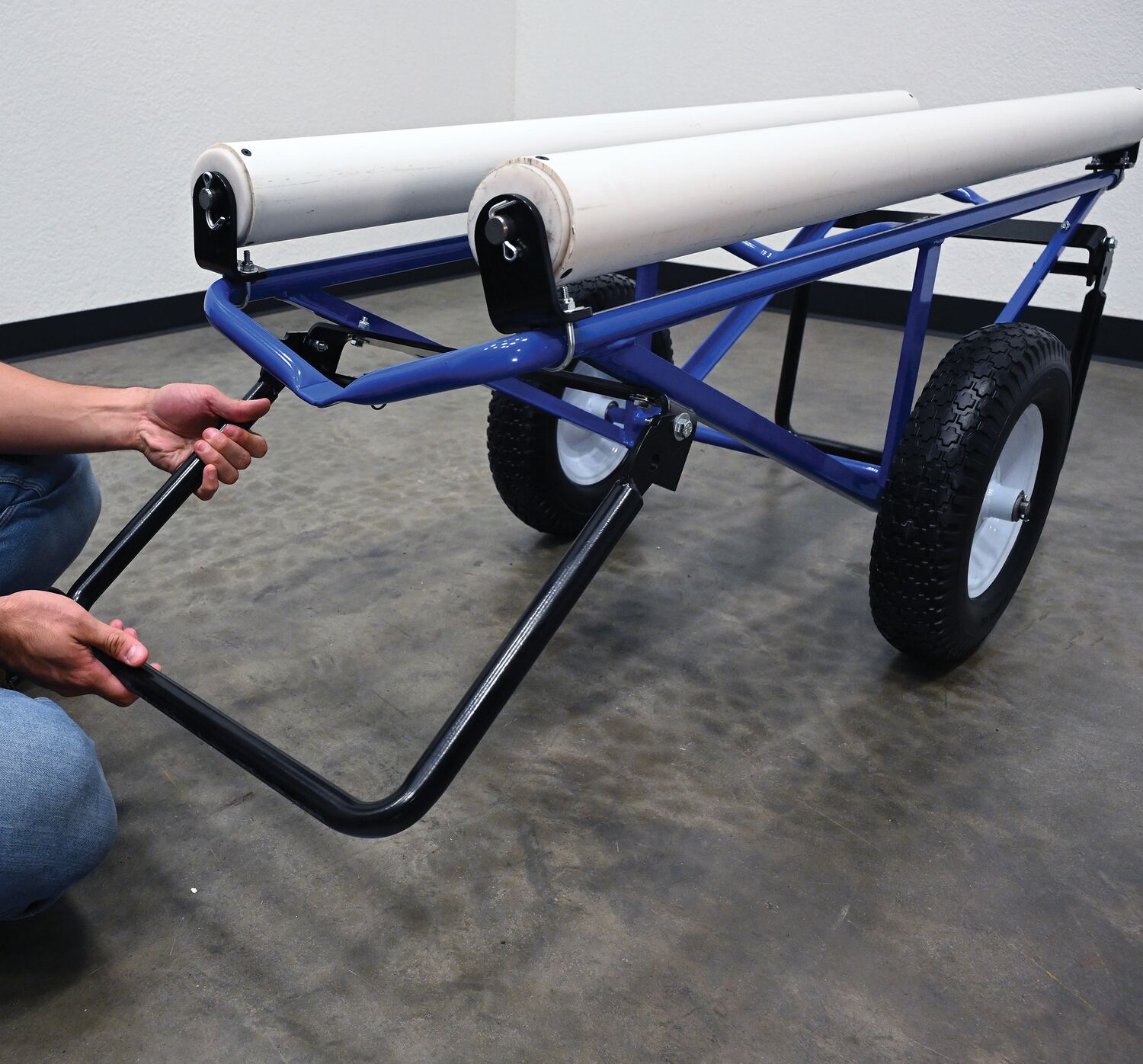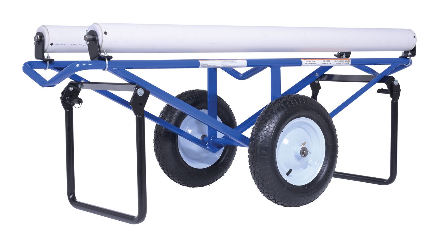 Portable Carpet Dispenser with Pneumatic Wheels 61 In. x 25-15/16 In. x 24-7/8 In. 500 Lb. Capacity BlueThis portable carpet dispenser minimizes lifting and pulling. Slide carpet onto rollers. Carpet unrolls as needed. Retractable legs stabilize the cart. Welded steel construction with powder coat blue finish.
