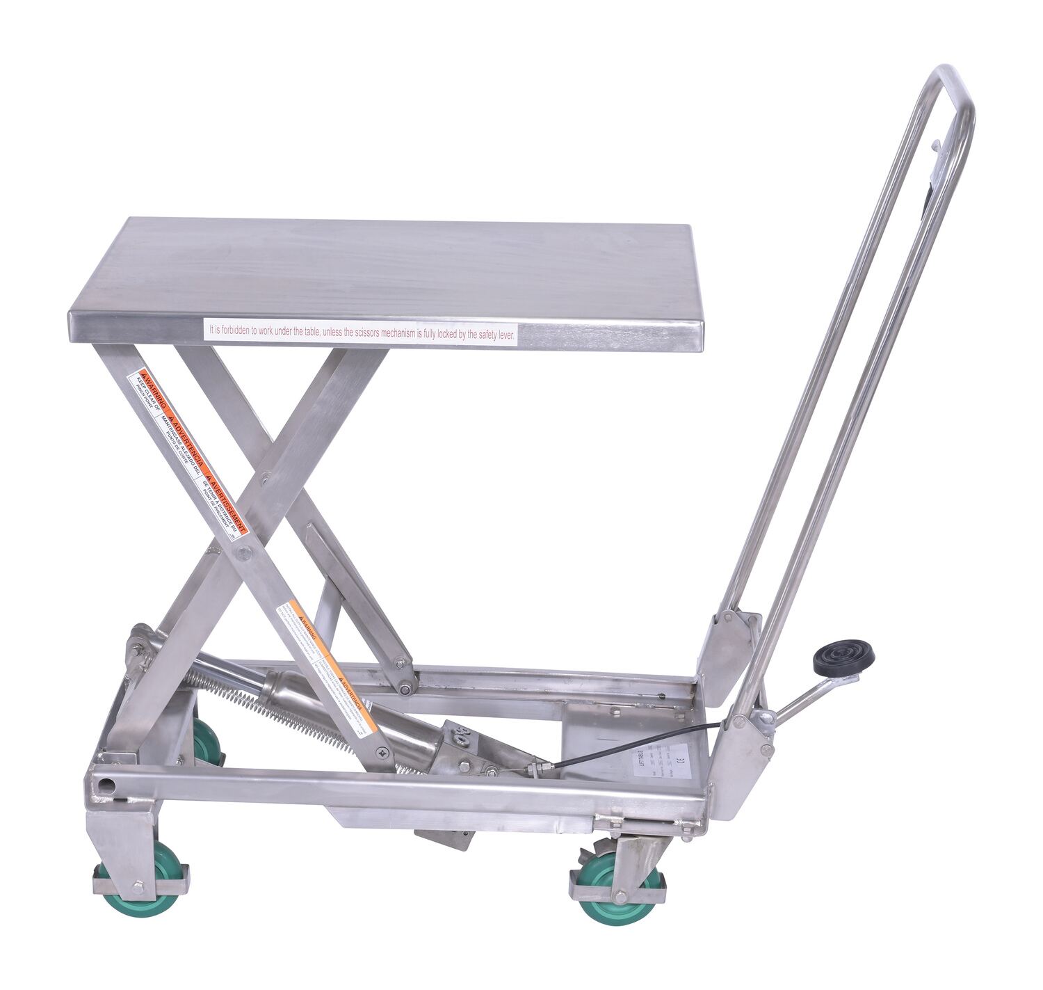 Stainless Steel Scissor Cart 17-3/4 In. x 27-5/8 In. 300 Lb. Capacity SilverOur fully welded Stainless Steel carts are suitable for most food, medical and pharmaceutical industry settings. They are also suitable for wash-down applications. The quick manual raising and lowering lets the user adjust the height to their desired preference. While an open platform design makes for simple loading and unloading from all sides. Capacity is rated for 300 lbs.