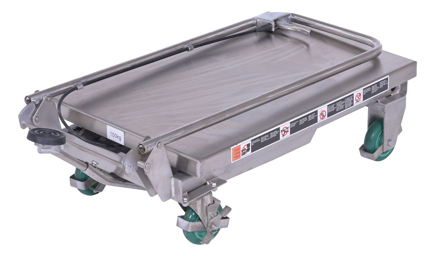 Our fully welded Stainless Steel carts are suitable for most food, medical and pharmaceutical industry settings. They are also suitable for wash-down applications. The quick manual raising and lowering lets the user adjust the height to their desired preference. While an open platform design makes for simple loading and unloading from all sides. Capacity is rated for 300 lbs.