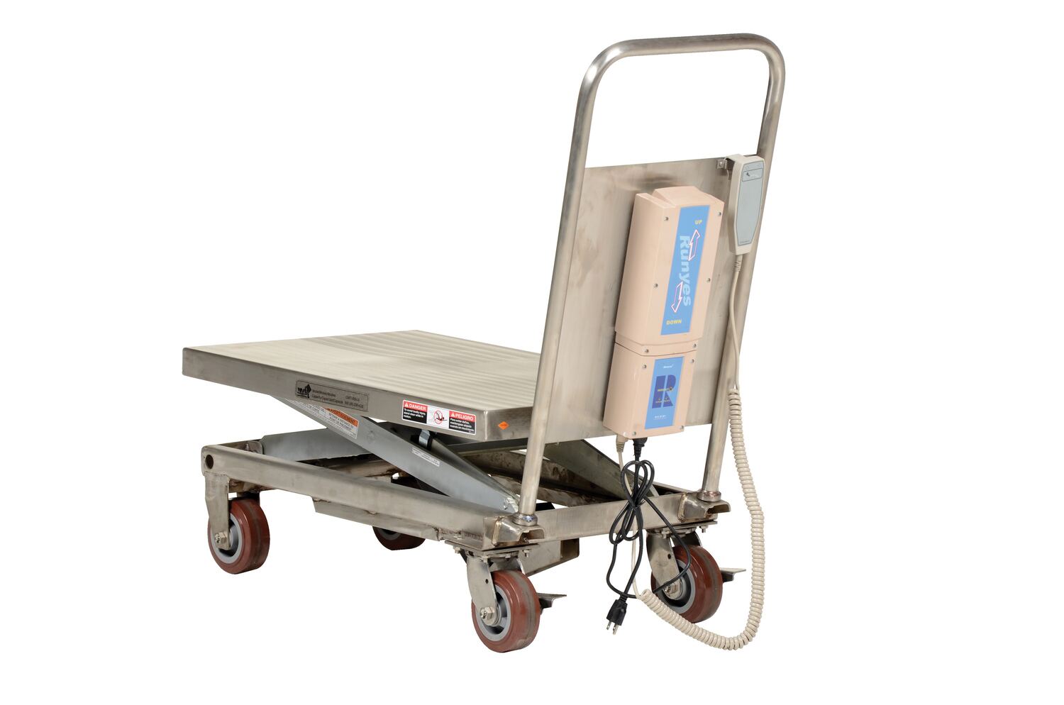 Partially Stainless Steel Linear Actuated Elevating Cart 19-1/2 In. x 32 In. 500 Lb. Capacity Blue/SilverThe linear actuated elevating cart transports materials from workstation to workstation with ease. The platform is raised and lowered with an electric linear actuator for precise positioning. Linear actuator will not allow platform to drift down- a common problem with hydraulic carts. This linear actuated cart is powered with a DC battery and features an on-board charger. A hand held pendant control connects to power unit with a coil cord. The units rolls smoothly on two rigid and two swivel casters. The platform, handle, base frame, caster brackets, and hardware are stainless steel. The scissor legs are zinc-plated. Battery pack, charger, and hand control are plastic. The linear actuator is plastic with a chrome-plated piston, while the wheels are poly-on-poly. Features an internal safety velocity fuse in each cylinder.