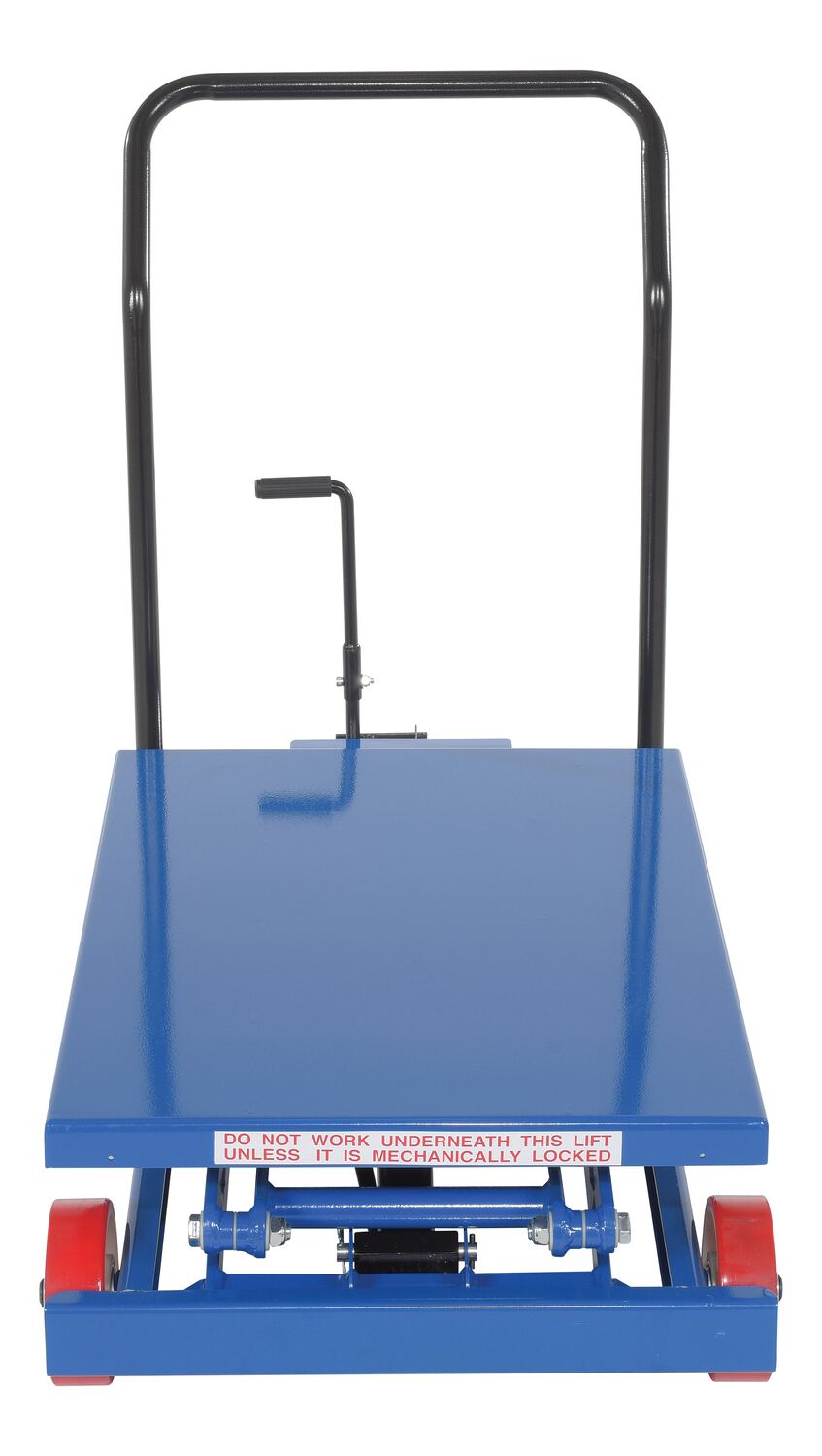 Steel Premium Double Scissor Cart with Foot Release 23-1/4 In. x 33 In. 600 Lb. Capacity BlueThe premium scissor lift cart is constructed of heavy duty steel and designed to withstand the most demanding industrial environments. The simplicity and compactness of these products make them ideal for lifting and transporting loads, order-picking, die handling, and for use in support of assembly operations. There is little exertion required to raise and lower the deck due to the high quality foot-actuated, single speed hydraulic pump. The hydraulic system is equipped with an overload protection valve. Each cart has safety stops to prevent an empty deck from lowering while performing maintenance. A unique tilt-up table top allows for safe and easy maintenance. The two rigid front casters and two rear swivel polyurethane casters with brake provide a high degree of maneuverability; each swivel wheel is protected by guards and is equipped with brakes. Features an internal safety velocity fuse in each cylinder.