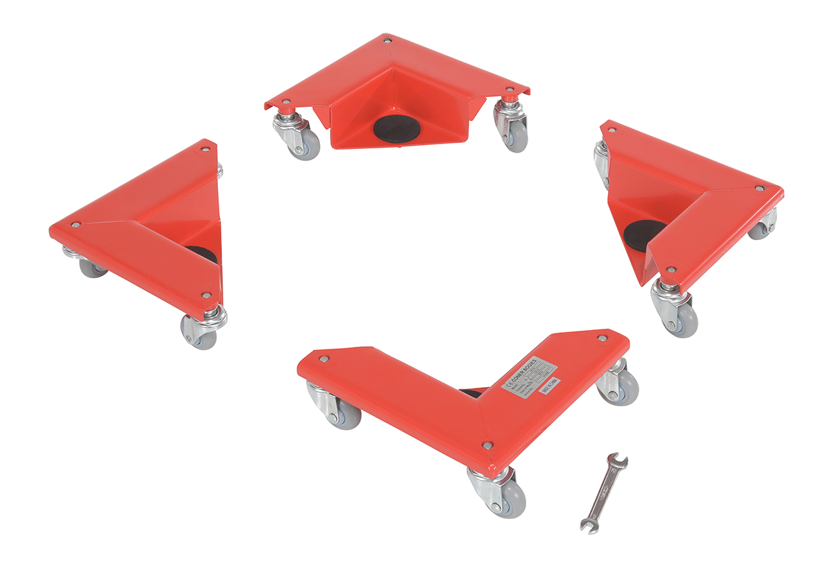Steel Corner Mover Dolly 4 Pack 300 Lb. Capacity RedA corner mover allows the user to move and get into spots that would otherwise be impossible. The three sided unit allows rectangular and square item to be easily maneuvered. A smooth powder coated finish allows for simple handling and provides long lasting surface stability. The attached casters let the user turn in the direction that best suits the current setting.