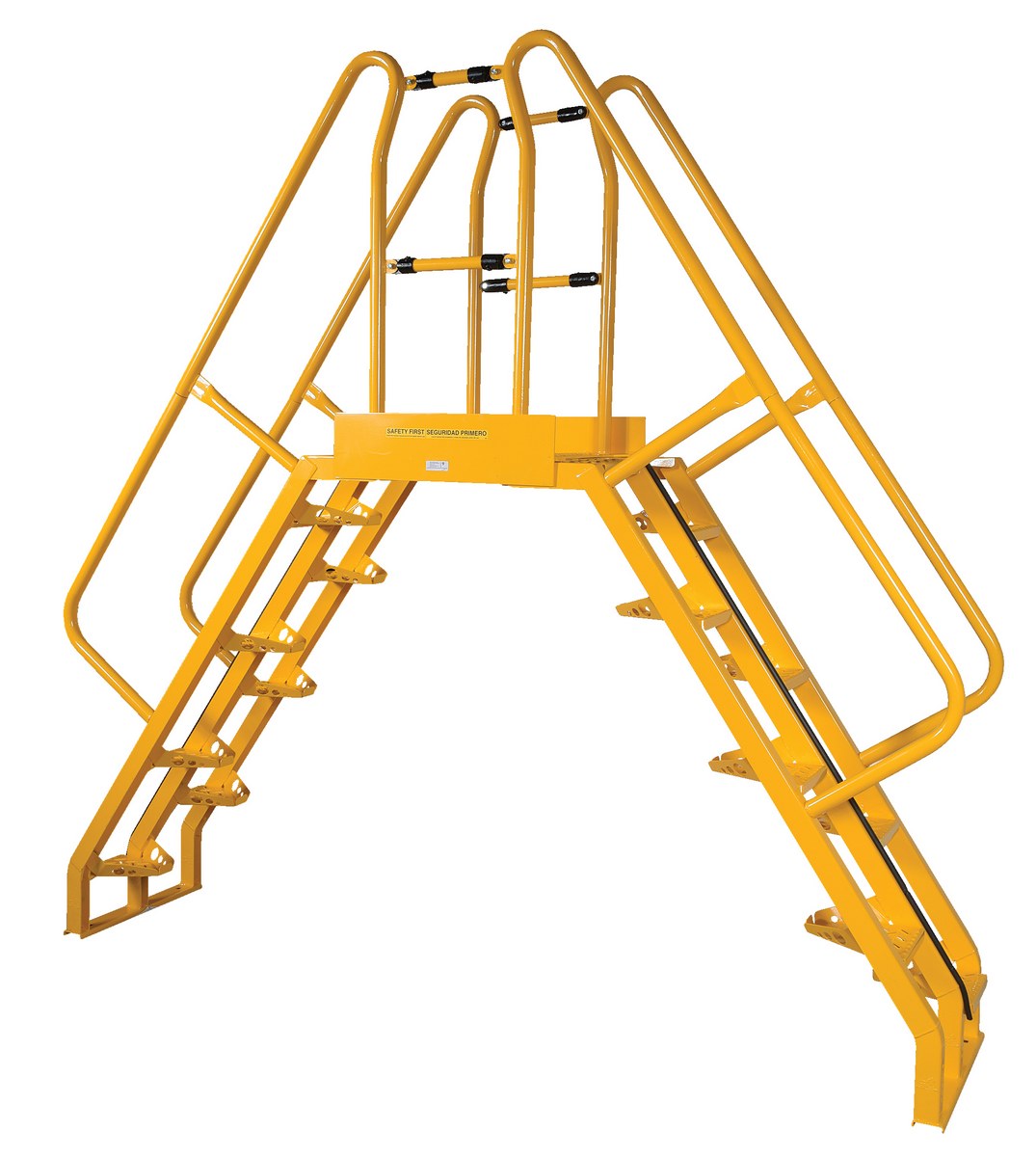 Mount this alternating step cross-over ladder where you need permanent access at crossover points. Alternating step design for shorter overall span than other units. The upper platform features removable two sided high handrail with mid-rail and fixed toe boards to prevent objects from rolling off. Includes lag-down points for securing to floor.