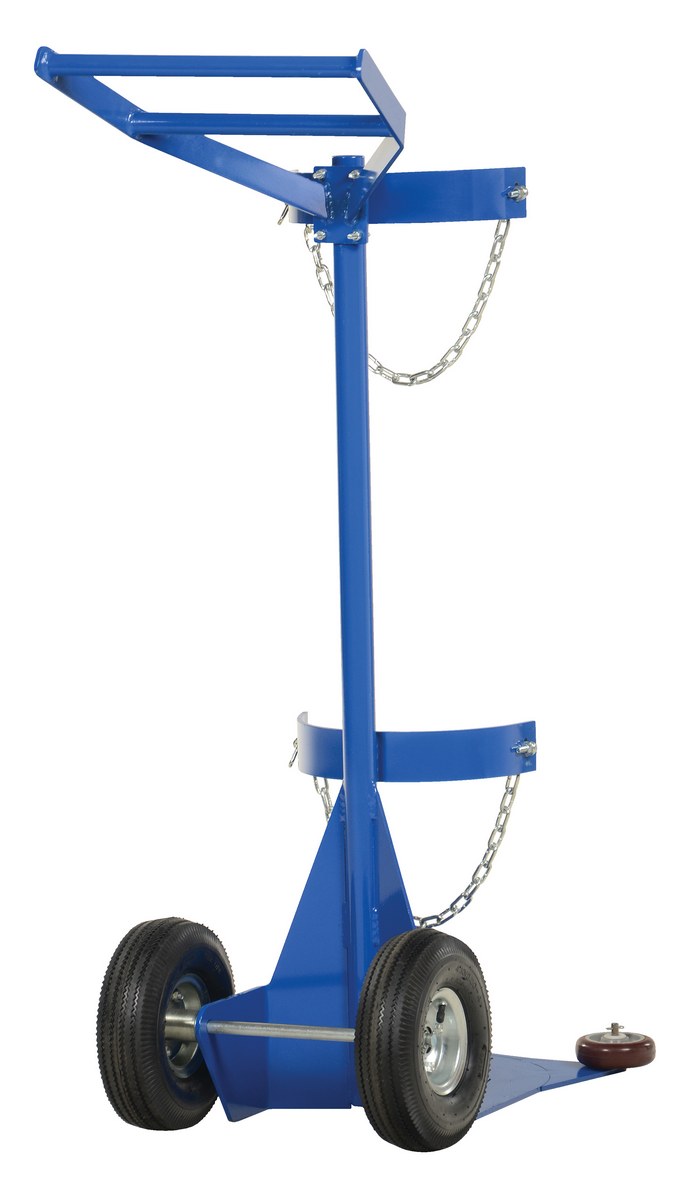 Steel Portable Deluxe Cylinder Lifter with Pneumatic Wheels 27-1/16 In. x 19 In. x 51-3/8 In. 500 Lb. BlueThe Cylinder dolly transports cylinders from workstation to workstation. This deluxe version feature roller guides attached to the nose plate. The hard rubber roller guides allow for easier entry onto the nose plate. Secure the cylinder with the included restraint chains. Tilt unit back and transport.
