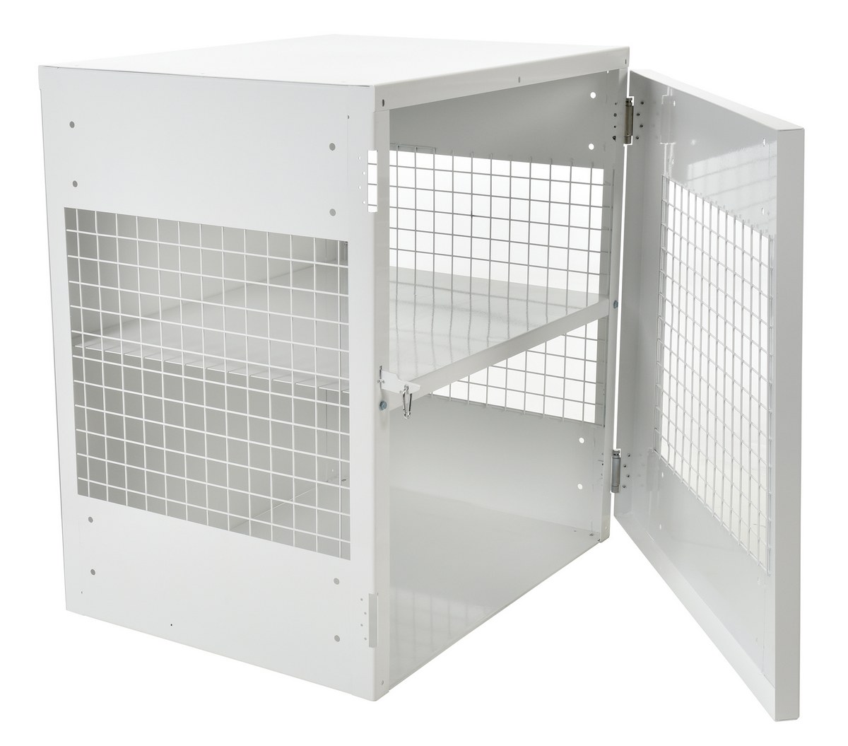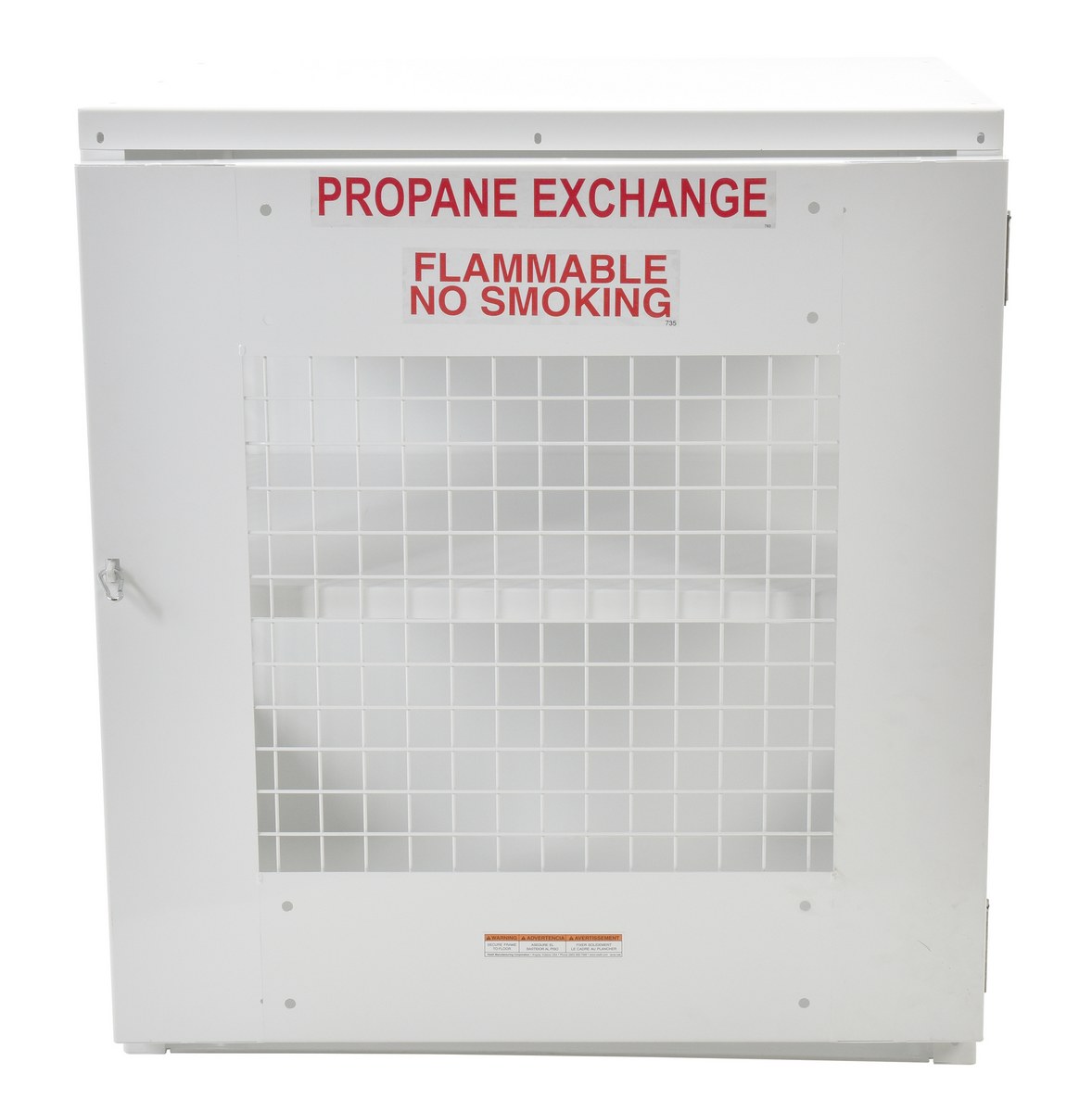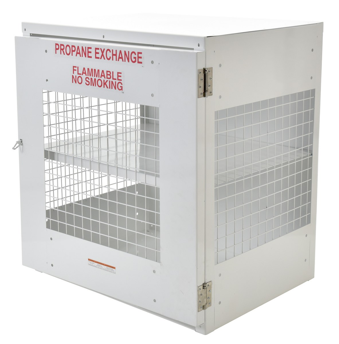 Steel Propane Exchange Cylinder Storage Cabinets with Mesh Door 12 Cylinder Capacity WhiteDurable steel propane exchange Cylinder storage cabinet for storage of standard propane gas cylinders. The sides are made of expanded steel mesh, the bottom, back and top are made of solid sheet steel. The front door is an expanded steel mesh panel. The door features stainless-steel spring-loaded hinges.