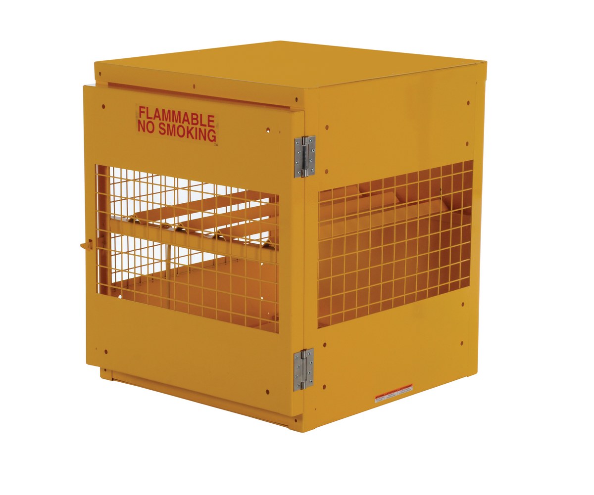 Steel cabinet for storage of cylinders. Cylinder storage capacity is based on cylinder size. Sides and door are made of expanded steel mesh. Bottom, back and top is made of solid sheet steel. Lockable doors protect cylinders (padlock not included). Base includes lag holes for securing cylinders. Rugged steel construction with safety yellow finish.