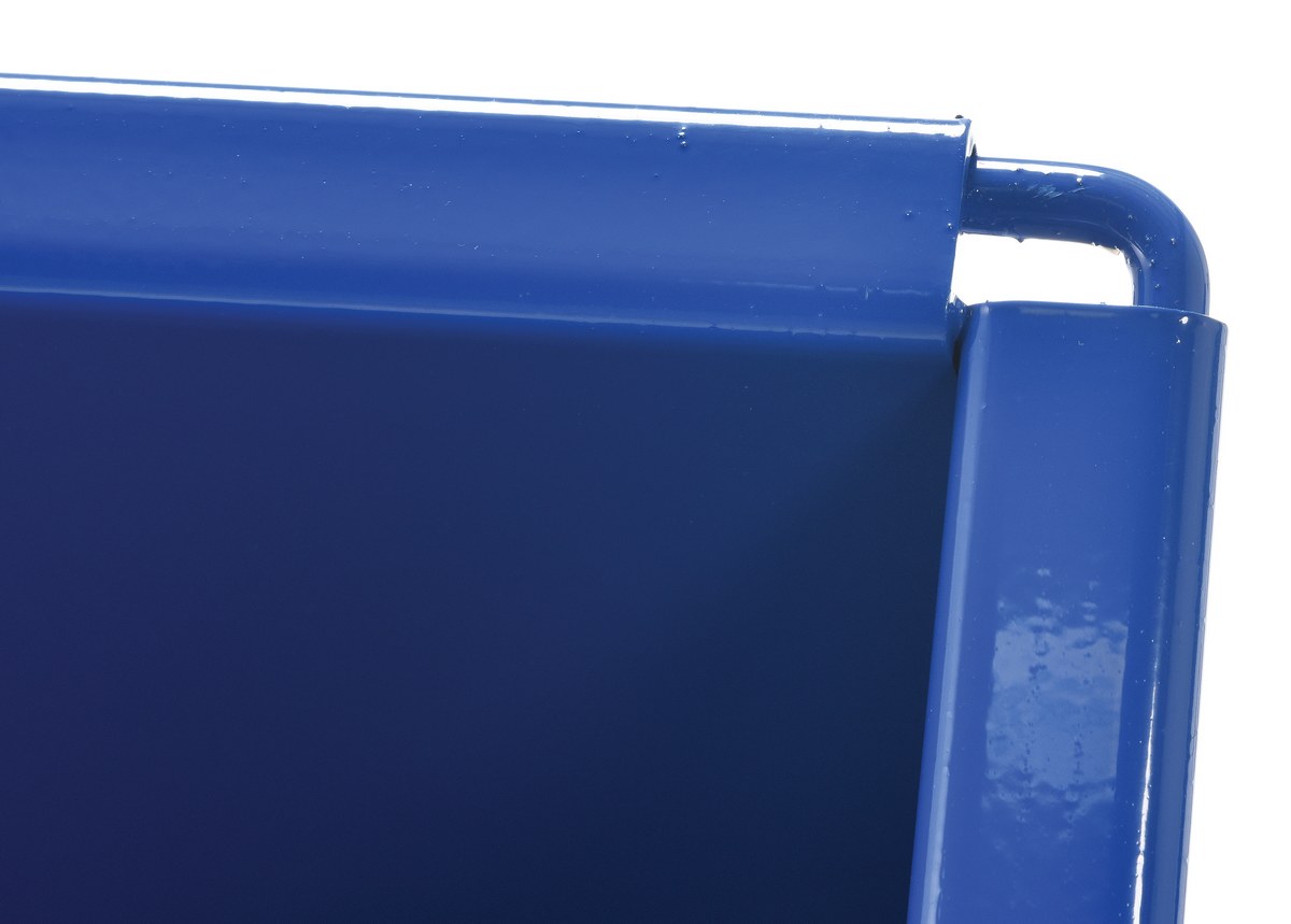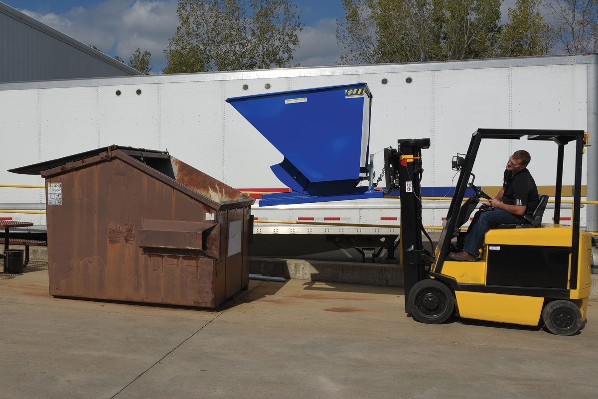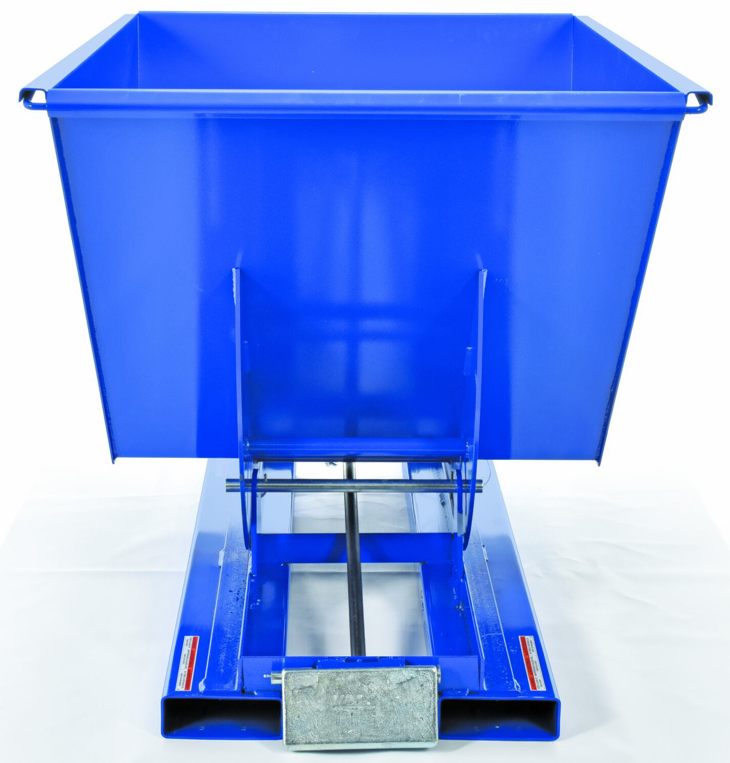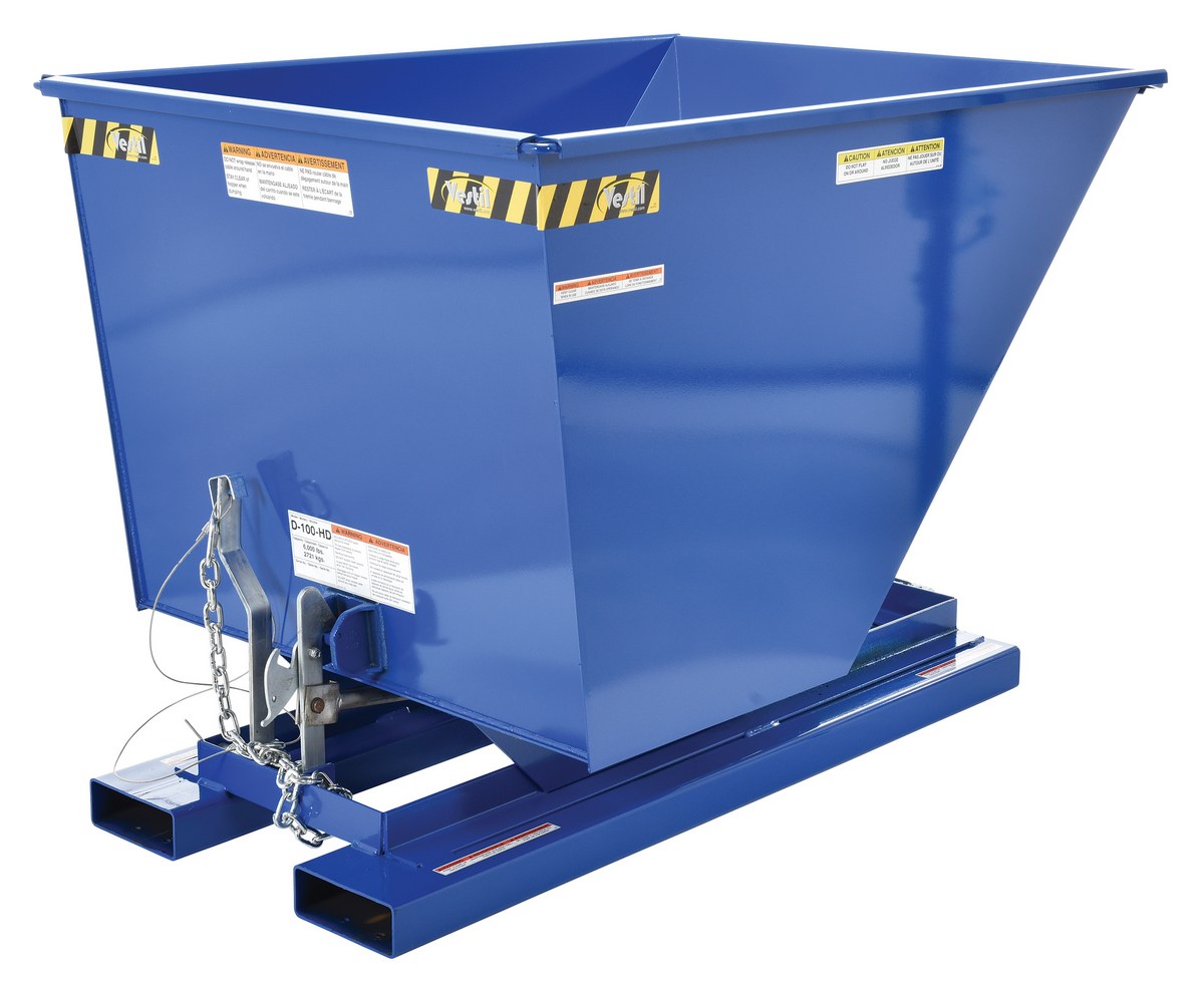 Steel Heavy Duty Self Dumping Hopper 1 Cubic Yard 6000 Lb. Capacity BlueThis Heavy Duty self-dumping steel Hopper with bumper release automatically dumps when bumper release contacts the front of the dumpster. Hopper returns to an upright and locked position automatically after it dumps. Also includes a cable that may be operated from the seat of the fork truck to manually dump the hopper. The included safety restraint should be properly secured to a fork truck before dumping. (Length dimension is measured at top of chute.) Hopper is stackable if you stack the top hopper turned ninety (90) degrees from the bottom. Self-dumping hoppers facilitate compliance with OSHA general industry rule 29 CFR 1910.178(m)(5)(iii) by allowing lift truck operators to remain at the controls of their truck throughout the dumping process.