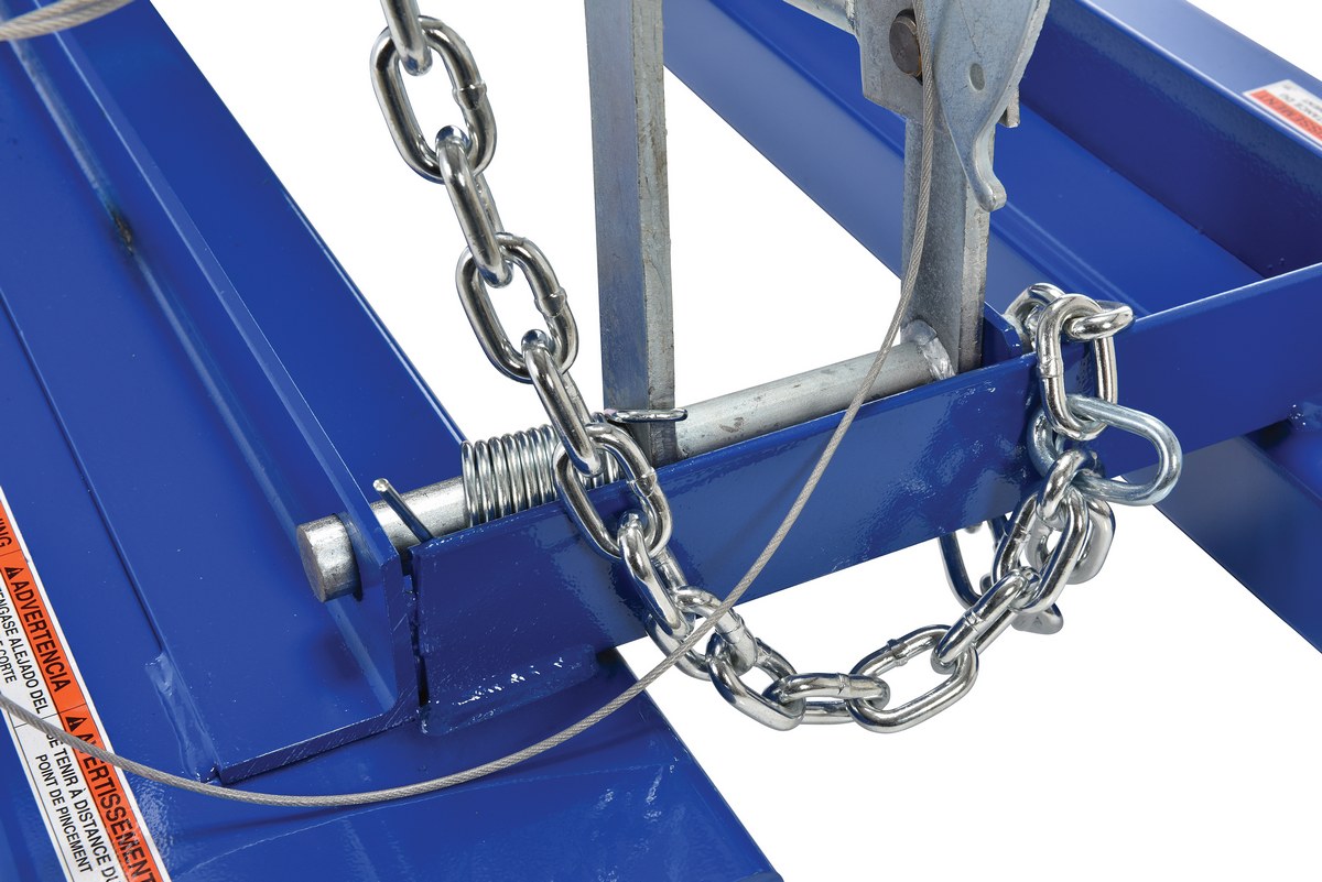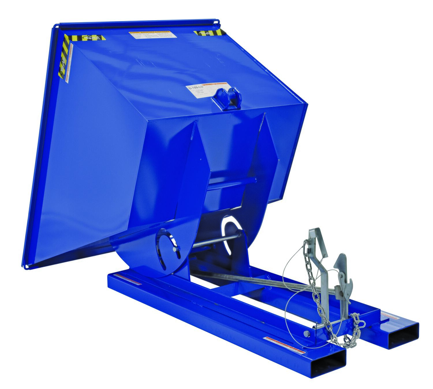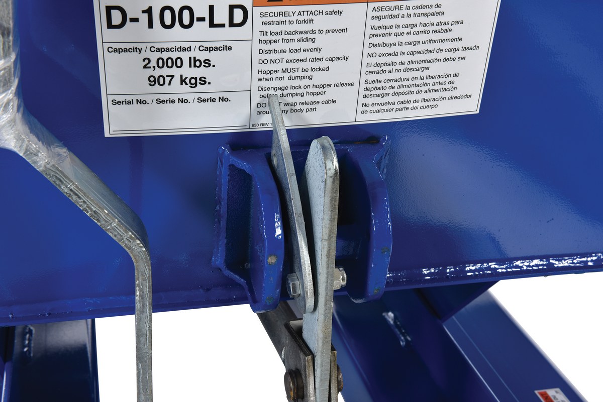 Steel Light Duty Self Dumping Hopper 1 Cubic Yard 2000 Lb. Capacity BlueThis Light Duty self-dumping steel Hopper with bumper release automatically dumps when bumper release contacts the front of the dumpster. Hopper returns to an upright and locked position automatically after it dumps. Also includes a cable that may be operated from the seat of the fork truck to manually dump the hopper. The included safety restraint should be properly secured to a fork truck before dumping. (Length dimension is measured at top of chute.) Hopper is stackable if you stack the top hopper turned ninety (90) degrees from the bottom. Self-dumping hoppers facilitate compliance with OSHA general industry rule 29 CFR 1910.178(m)(5)(iii) by allowing lift truck operators to remain at the controls of their truck throughout the dumping process.