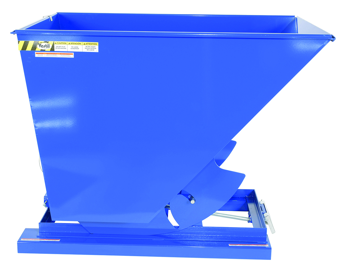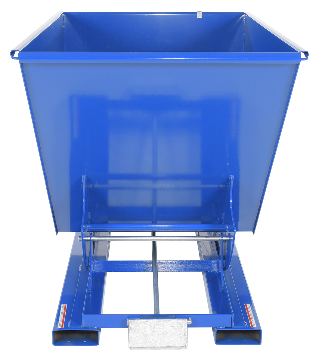 Steel Heavy Duty Self Dumping Hopper 1-1/2 Cubic Yard 6000 Lb. Capacity BlueThis Heavy Duty self-dumping steel Hopper with bumper release automatically dumps when bumper release contacts the front of the dumpster. Hopper returns to an upright and locked position automatically after it dumps. Also includes a cable that may be operated from the seat of the fork truck to manually dump the hopper. The included safety restraint should be properly secured to a fork truck before dumping. (Length dimension is measured at top of chute.) Self-dumping hoppers facilitate compliance with OSHA general industry rule 29 CFR 1910.178(m)(5)(iii) by allowing lift truck operators to remain at the controls of their truck throughout the dumping process.