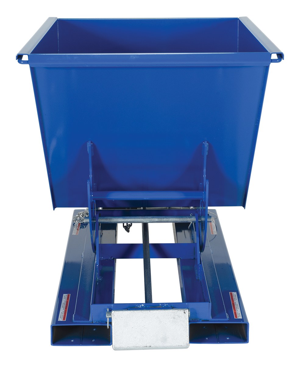 Steel Medium Duty Self Dumping Hopper 1/2 Cubic Yard 4000 Lb. Capacity BlueThis Medium Duty self-dumping steel Hopper with bumper release automatically dumps when bumper release contacts the front of the dumpster. Hopper returns to an upright and locked position automatically after it dumps. Also includes a cable that may be operated from the seat of the fork truck to manually dump the hopper. The included safety restraint should be properly secured to a fork truck before dumping. (Length dimension is measured at top of chute.) Hopper is stackable if you stack the top hopper turned ninety (90) degrees from the bottom. Self-dumping hoppers facilitate compliance with OSHA general industry rule 29 CFR 1910.178(m)(5)(iii) by allowing lift truck operators to remain at the controls of their truck throughout the dumping process.