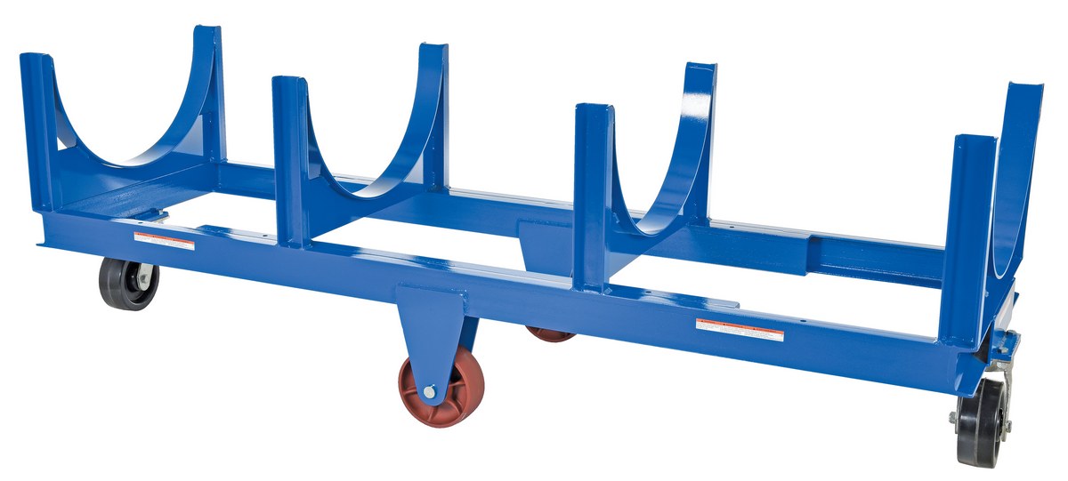 Steel Heavy Duty Cradle 99-1/16 In. x 31-1/2 In. x 32-3/8 In. 10000 Lb. Capacity BlueMove and store pipe, channel, bar stock, barrels, or drums with this Heavy Duty cradle cart. A large open design that makes loading and unloading by fork trucks and slings easy. All welded construction. Wheels are mounted in a diamond pattern to allow the truck to tilt when going over thresholds and turn about on its own center. Lightweight Aluminum cradle cart fits all small to medium loads. Powder coat finish standard on steel cart.