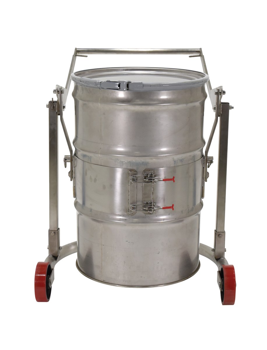 Stainless Steel Manual Drum Carrier/Rotator For Steel Drums 55 Gallon 800 Lb. Capacity SilverStainless steel drum carrier/rotator is ideal for raising, transporting, rotating, tilting and draining 55 gallon steel drums. Sturdy handle provides leverage for heavy lifting and easily locks drum in position 5 to 11" off floor. Dual fingertip operated locks secure the raised drum. 304 All stainless steel construction.