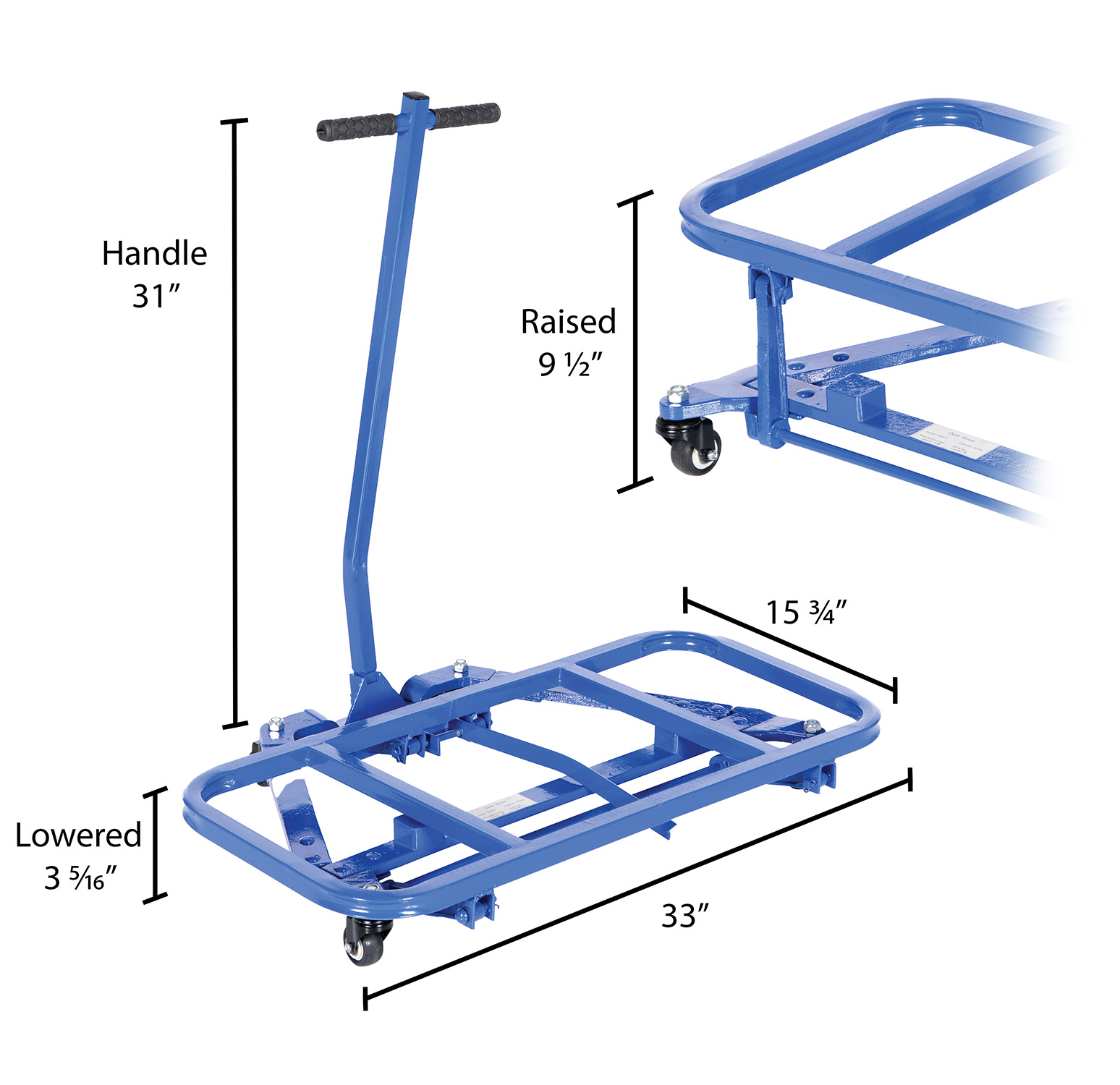 Steel Desk Mover 15-3/4 In. x 33 In. x 31 In. 600 Lb. Capacity BlueThe desk mover moves fully loaded desks without removing drawers and files. To use: position platform under desk pedestals and depress handle to raise desk and engage safety latch. Standard features include steel lift platform and removable handle. Elevated desk moves easily with or without handle on swivel rubber casters.