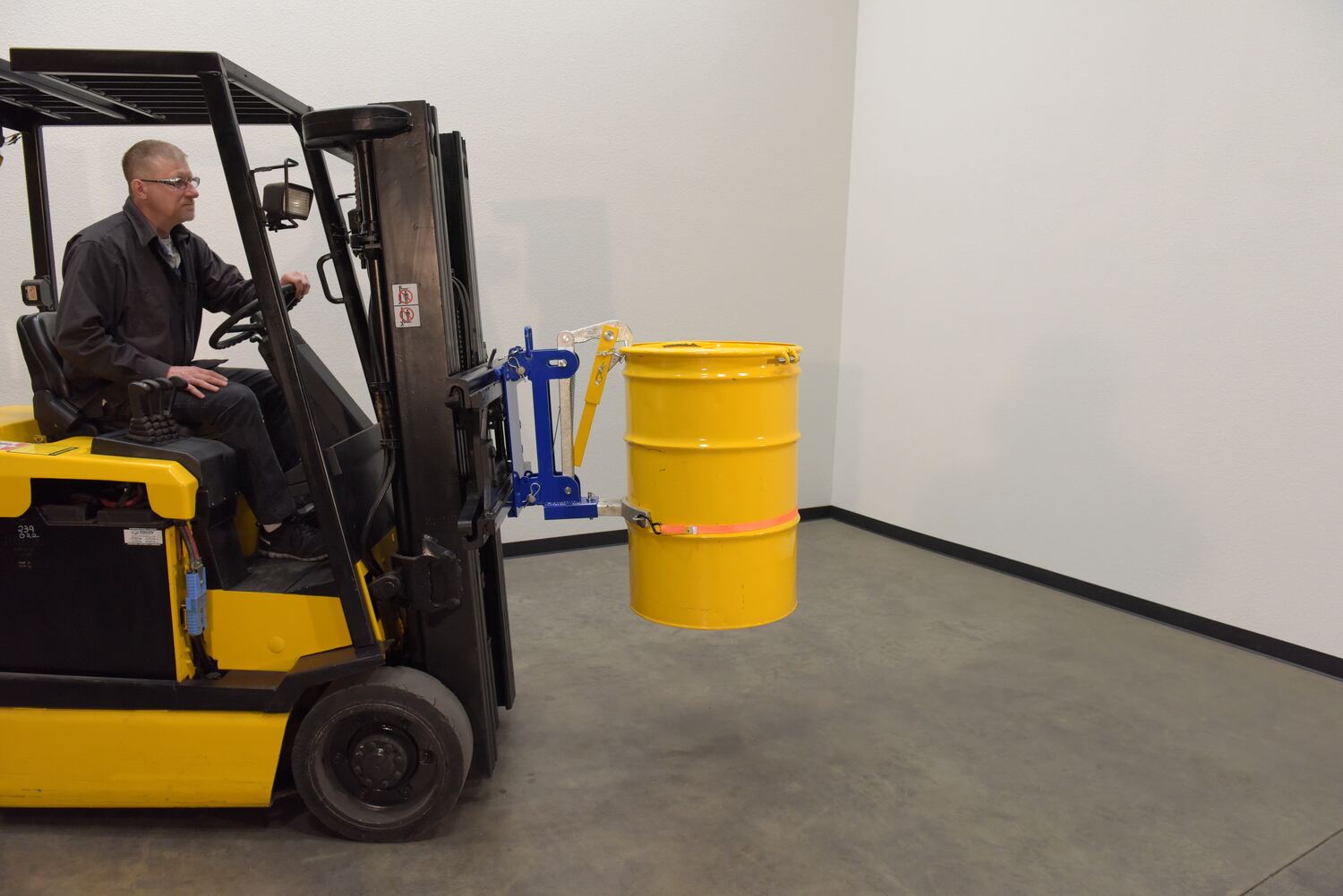 A drum lifter is a great way to quickly maneuver drums. This type of lifting option minimizes manual labor and time spent transferring drums between areas. The unit simply attaches to the carriage of the forklift and can be used immediately after installation. A durable finish protects the lifter from marring.