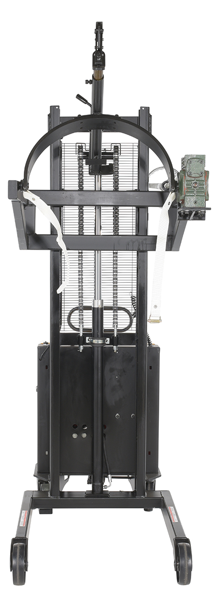 Steel DC Powered Drum Lifter/Rotator/Transporter 61 In. x 36-1/4 In. x 88 In. 550 Lb. Capacity Black/YellowA portable Drum Lifter/rotator/transporter has a DC battery powered lift operation and a manual hand crank gear mechanism rotation (on-board charger standard). For use with steel and fiber drums.
