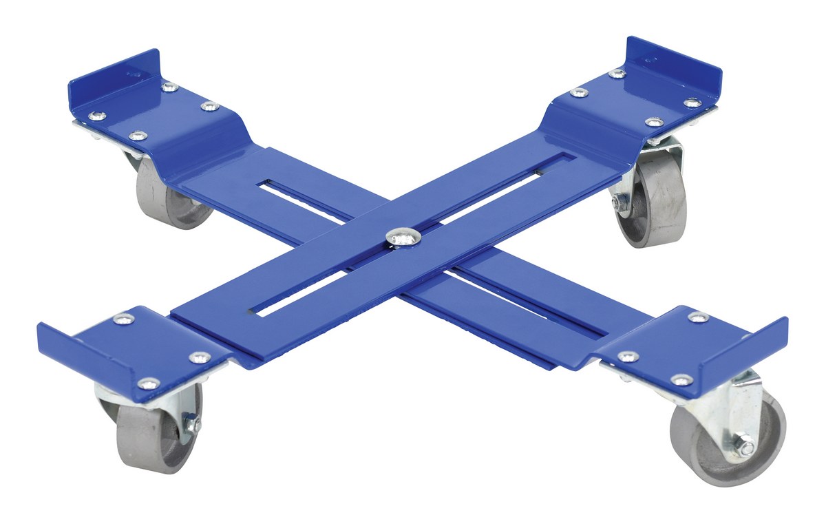 Steel Mobile Drum Dolly-Adjustable with Cast Steel Wheels 25-7/8 In. x 25-7/8 In. x 5-1/16 In. 1200 Lb. Capacity BlueThe multi-level drum dolly is ideal for transferring a variety of drum and crate sizes. The steel construction can withstand heavy loads on a daily basis. The smooth finish allows for simple handling from workstation to workstation.