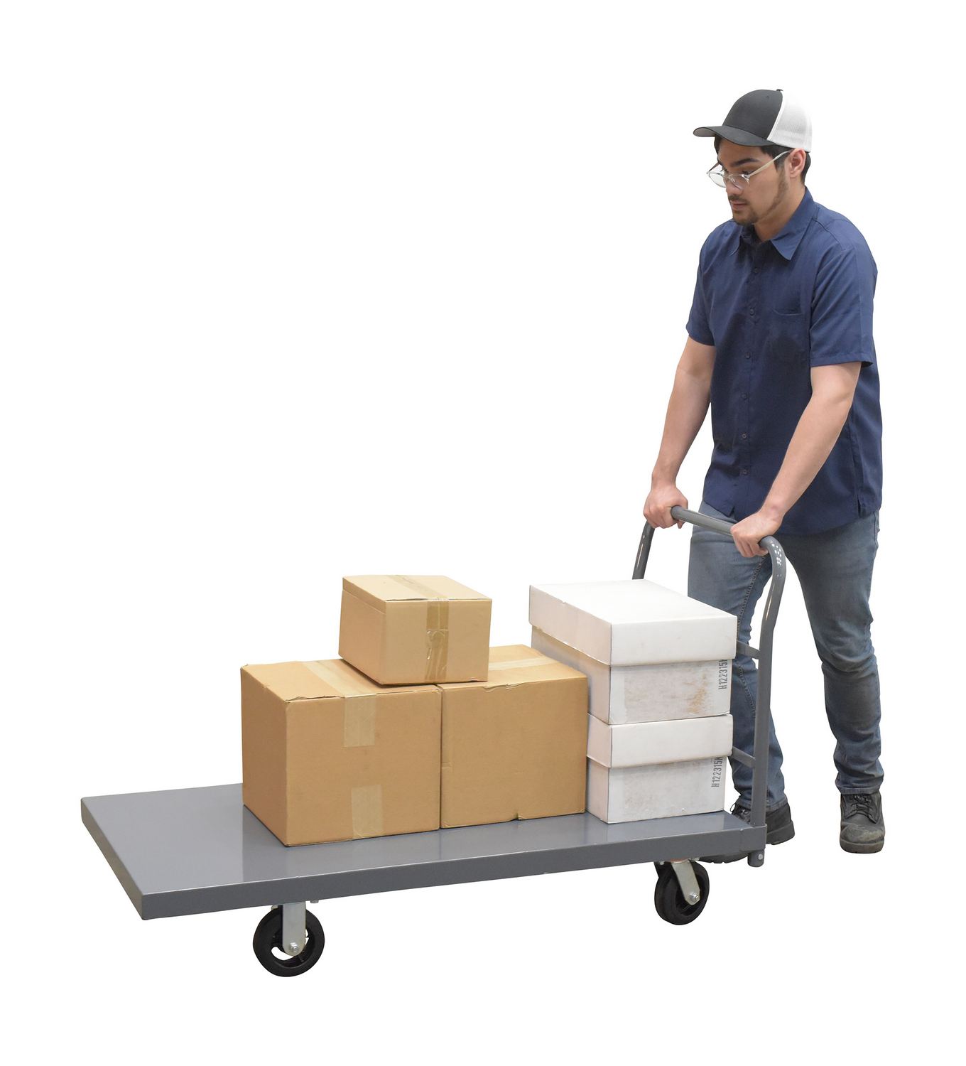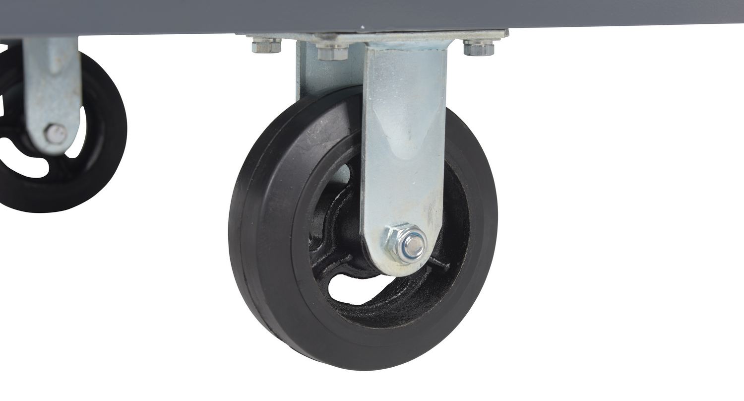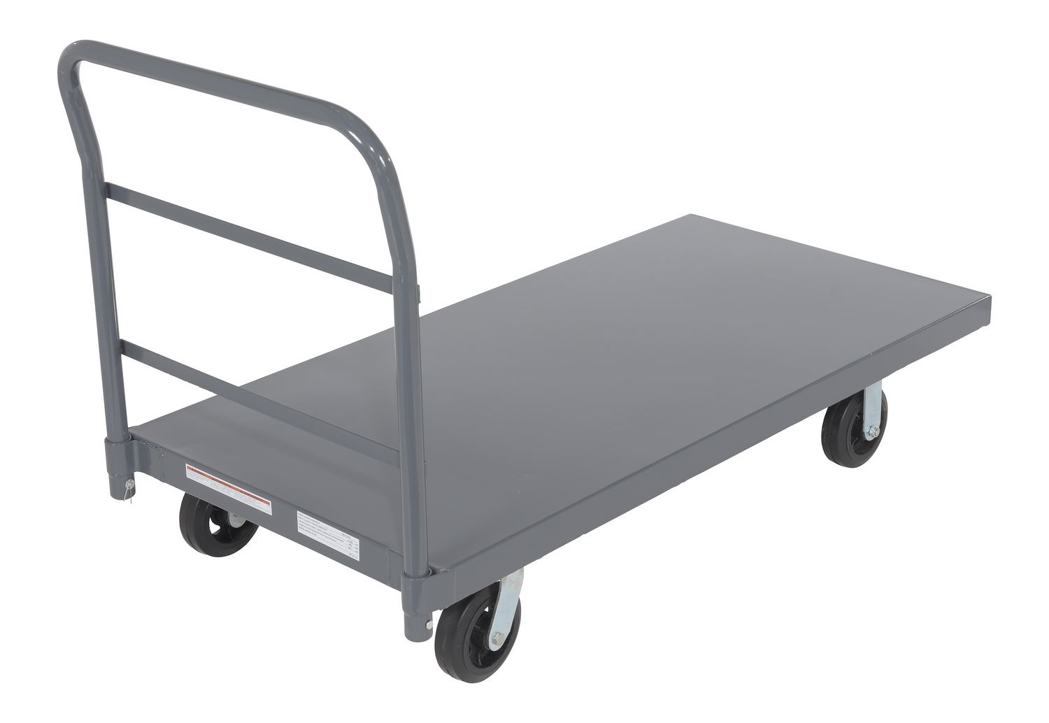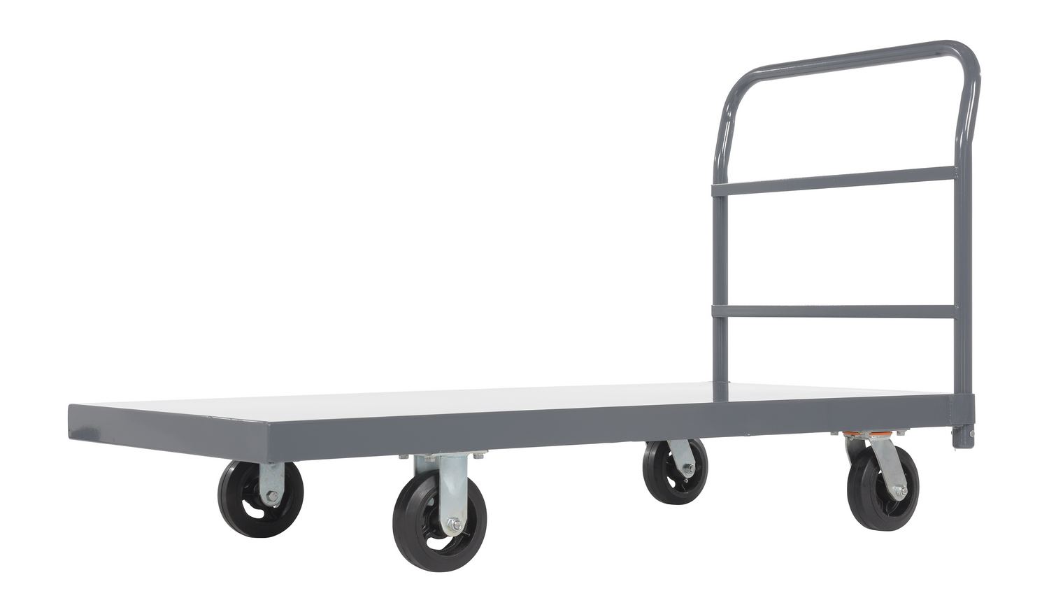 A steel platform truck is the perfect addition to any warehouse or shipping center. The steel platform design provides the user with a better sense of security. With a smooth surface, the amount of abrasion and scuffs during movement is limited. The steel handle allows the user to maintain an ergonomic posture while transferring goods. Mold on rubber casters roll smoothly. Powder coated finish provides added toughness.