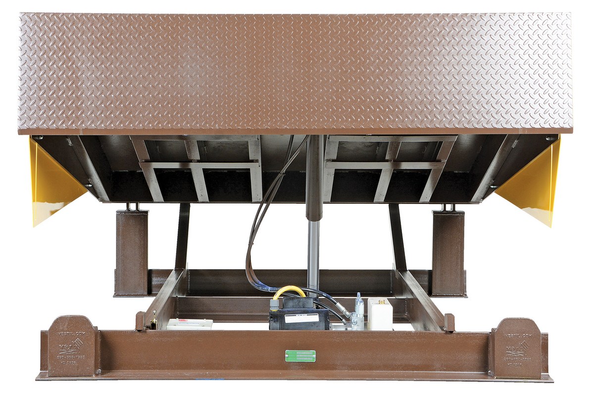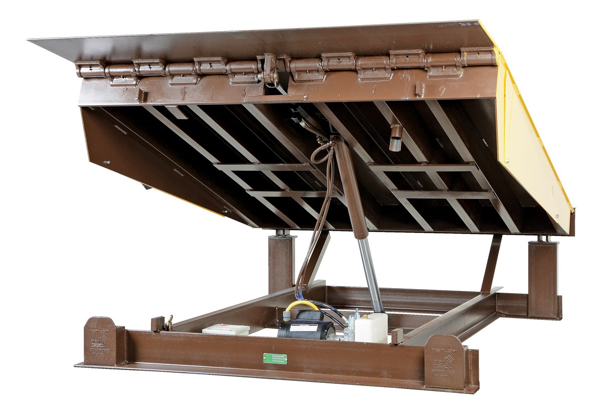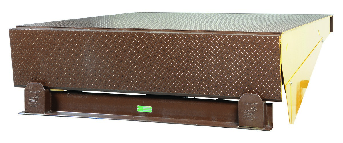 Steel Electric Hydraulic Dock Leveler 74"W x 86"L x 24"D Pit Dimensions, 25000 Lb. Capacity Brown/YellowThe electric hydraulic dock leveler is ideal for high usage dock areas. The hydraulic design is state of the art and consists of a single button operation. The operator pushes and holds the "raise" button which activates the hydraulic pump and raises the deck. When the deck reaches the raised position the lip automatically extends. The operator releases the "raise" button and the deck descends to rest on the trailer. The control box includes a red emergency stop button standard. When the truck pulls away, the deck descends to full down position, trips the limit switch and returns automatically to the level cross traffic position. It includes telescopic steel toe guards on both sides, flush with platform edge and includes two (2) laminated bumpers.