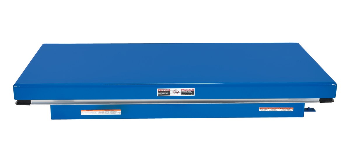 Steel Electric Hydraulic Lift Table 30 In. x 60 In. 3000 Lb. Capacity BlueThe electric hydraulic scissor lift table is used by all types of manufacturing and warehouse facilities. Safety features include a patented pinch point perimeter toe guard to protect pinch points while lowering the table, fused push button control, internal safety velocity fuse to maintain platform height in the event of hose or fitting failure, integral maintenance prop, adjustable upper travel limit switch to stop the table at maximum height, and displacement-style hydraulic cylinders for maximum strength. It also features a pressure plated pump, manifold system, and state-of-the-art lifetime lubricated bearings. The standard 56 frame electric motor is fully enclosed with additional voltage options available. Contact factory if platform dimensions are crucial.