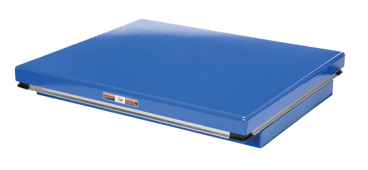 Steel Electric Hydraulic Lift Table 40 In. x 48 In. 3000 Lb. Capacity BlueThe electric hydraulic scissor lift table is used by all types of manufacturing and warehouse facilities. Safety features include a patented pinch point perimeter toe guard to protect pinch points while lowering the table, fused push button control, internal safety velocity fuse to maintain platform height in the event of hose or fitting failure, integral maintenance prop, adjustable upper travel limit switch to stop the table at maximum height, and displacement-style hydraulic cylinders for maximum strength. It also features a pressure plated pump, manifold system, and state-of-the-art lifetime lubricated bearings. The standard 56 frame electric motor is fully enclosed with additional voltage options available. Contact factory if platform dimensions are crucial.