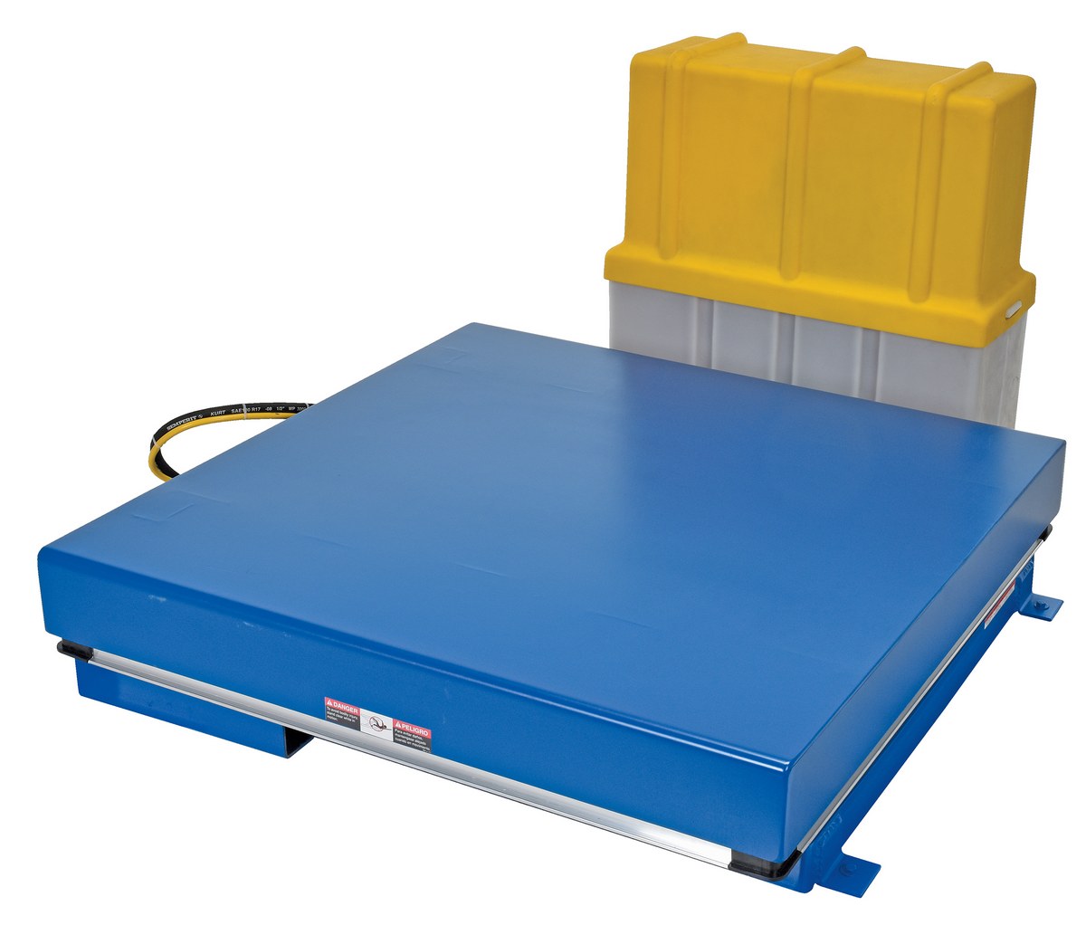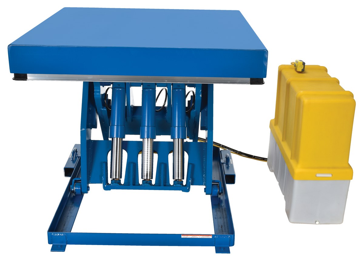 Steel Electric Hydraulic Lift Table 48 In. x 48 In. 12000 Lb. Capacity BlueThe electric hydraulic scissor lift table is used by all types of manufacturing and warehouse facilities. Safety features include a patented pinch point perimeter toe guard to protect pinch points while lowering the table, fused push button control, internal safety velocity fuse to maintain platform height in the event of hose or fitting failure, integral maintenance prop, adjustable upper travel limit switch to stop the table at maximum height, and displacement-style hydraulic cylinders for maximum strength. It also features a pressure plated pump, manifold system, and state-of-the-art lifetime lubricated bearings. The standard 56 frame electric motor is fully enclosed with additional voltage options available. Contact factory if platform dimensions are crucial.