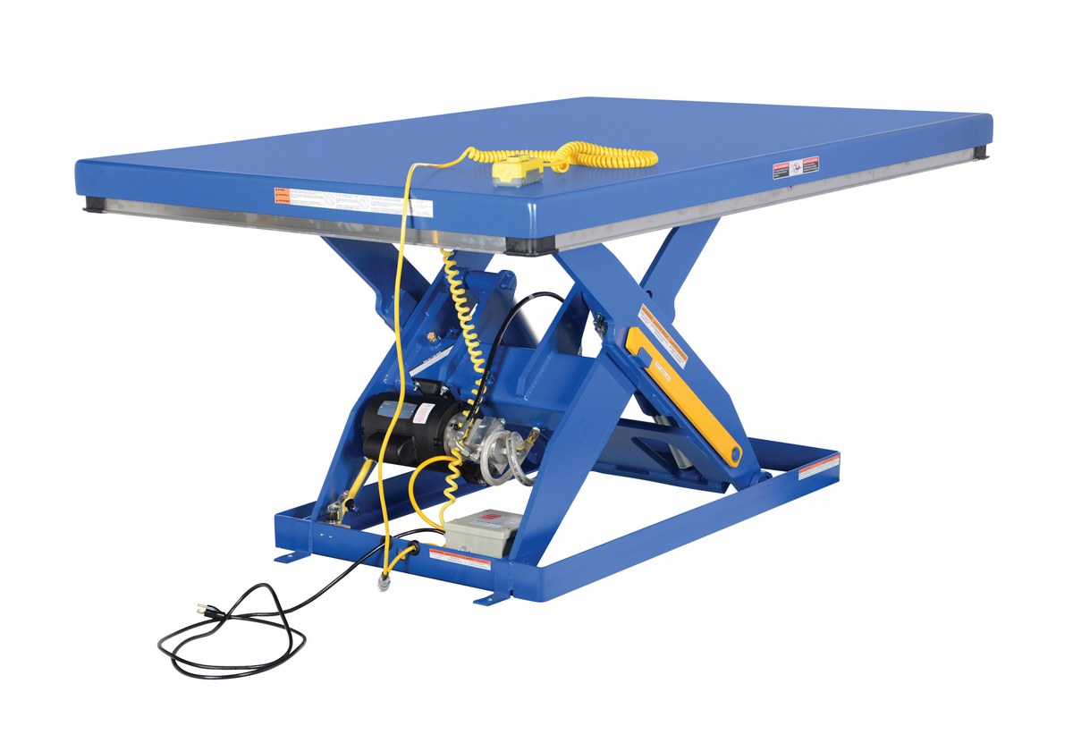 Steel Electric Hydraulic Lift Table 48 In. x 72 In. 3000 Lb. Capacity BlueThe electric hydraulic scissor lift table is used by all types of manufacturing and warehouse facilities. Safety features include a patented pinch point perimeter toe guard to protect pinch points while lowering the table, fused push button control, internal safety velocity fuse to maintain platform height in the event of hose or fitting failure, integral maintenance prop, adjustable upper travel limit switch to stop the table at maximum height, and displacement-style hydraulic cylinders for maximum strength. It also features a pressure plated pump, manifold system, and state-of-the-art lifetime lubricated bearings. The standard 56 frame electric motor is fully enclosed with additional voltage options available. Contact factory if platform dimensions are crucial.