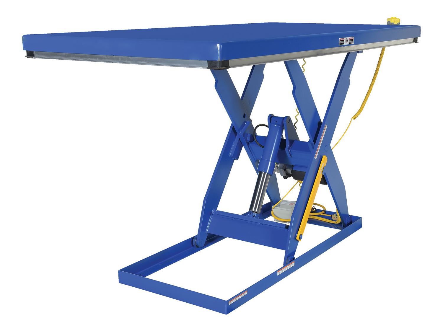 Steel Electric Hydraulic Lift Table 48 In. x 96 In. 2000 Lb. Capacity BlueThe electric hydraulic scissor lift table is used by all types of manufacturing and warehouse facilities. Safety features include a patented pinch point perimeter toe guard to protect pinch points while lowering the table, fused push button control, internal safety velocity fuse to maintain platform height in the event of hose or fitting failure, integral maintenance prop, adjustable upper travel limit switch to stop the table at maximum height, and displacement-style hydraulic cylinders for maximum strength. It also features a pressure plated pump, manifold system, and state-of-the-art lifetime lubricated bearings. The standard 56 frame electric motor is fully enclosed with additional voltage options available. Contact factory if platform dimensions are crucial.