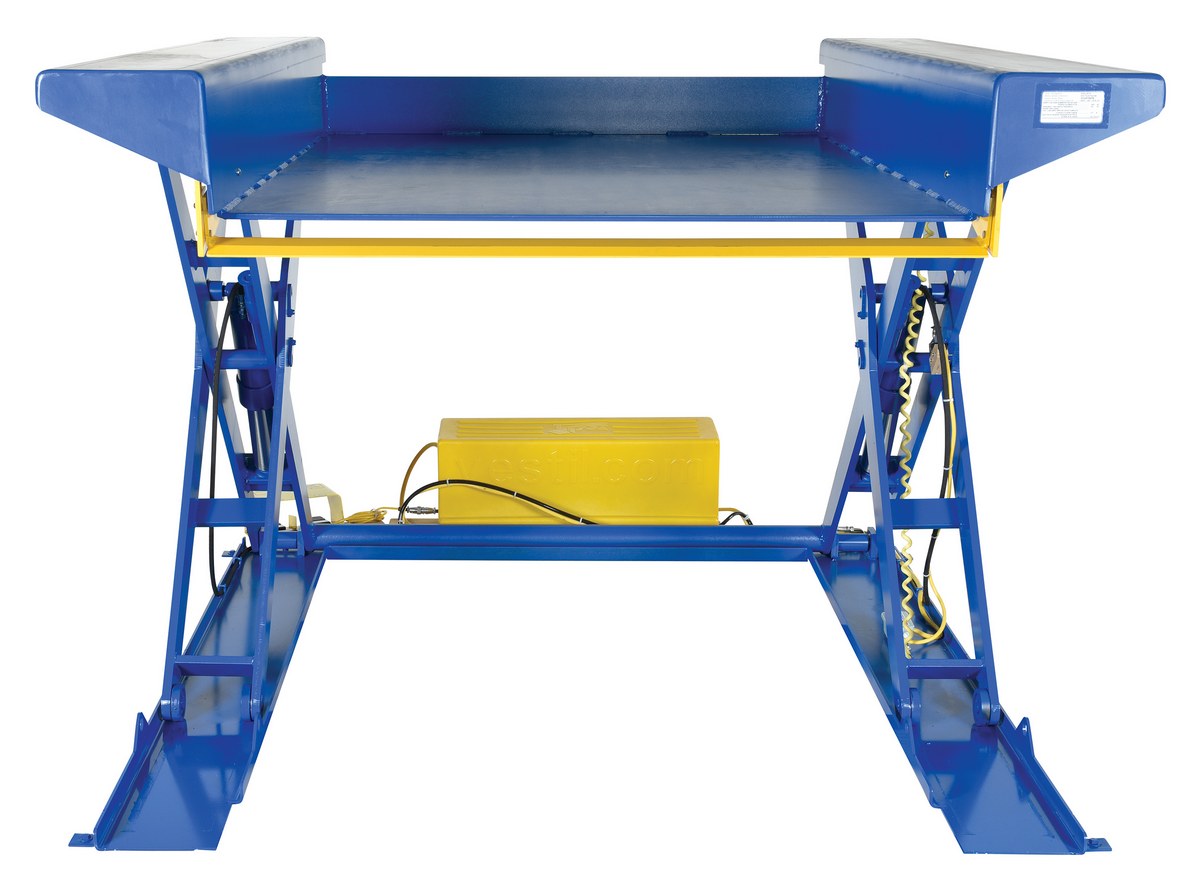 Steel Ground Lift Scissor Table 52 In. x 70 In. 4000 Lb. Capacity BlueThe ground lift scissor table is designed for use when fork trucks are not available. The pallets can be loaded onto the platform with pallet trucks and raised to an ergonomic working height. Safety features include an entry-side electric toe guard to protect pinch points during lowering of the table, velocity fuse to maintain platform height in the event of a hose or fitting failure, foot control, maintenance prop, and upper travel limit switch to stop the table at maximum height and reduce motor wear. The motor is totally enclosed standard with additional voltage options available. The remote power unit can be located up to eight (8) feet away from the table. Optional accordion skirting is available.