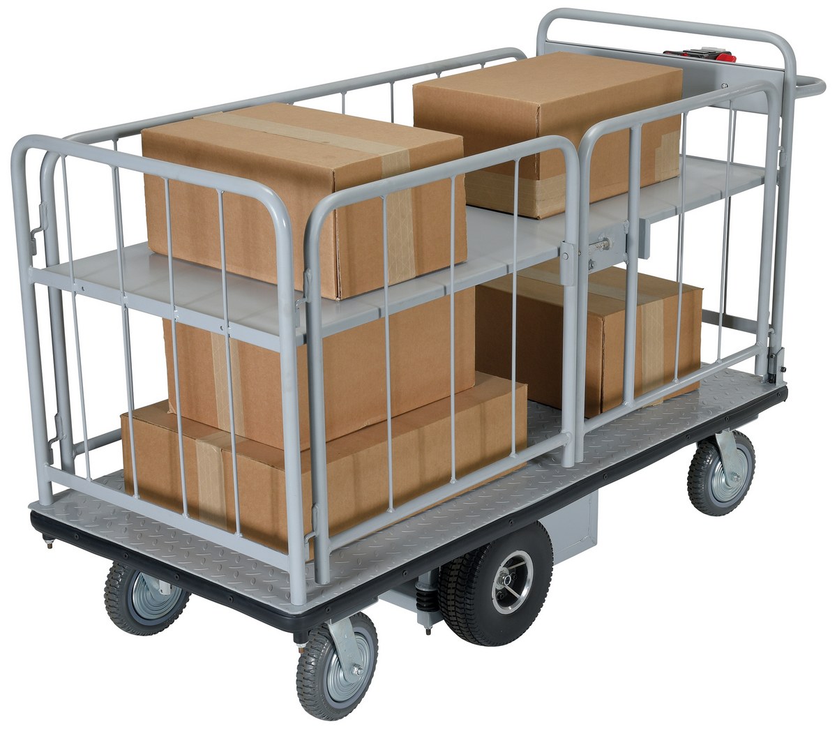 Steel Electric Material Handling Cart with Sides 1 Shelf 28 In. x 60 In. 1,500 Lb. Capacity GrayElectric material handling carts are ideal for moving heavy loads safely and easily throughout warehouses, offices, schools, and hospitals and incorporates a multitude of features to make light work of heavy loads. Reduce injury and increase productivity with these high quality carts. Features an 800W electric drive motor with (2) two 12V batteries for power and on-board 115V AC battery charger. The handle includes forward and reverse throttle control levers, an emergency reverse switch, a battery level gauge, and a slow/fast speed switch. Pinpoint turning is accurate with the mid-axle drive feature.