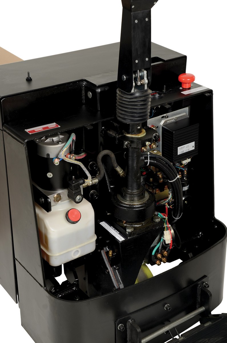 Steel Electric Pallet Truck with AGM Batteries 27 In. x 96 In. 4500 Lb. CapacityThe fully powered electric pallet truck has an easy and quick operation. The unit raises and lowers loads with a push of a button. It can maneuver loads in warehouses and trailers. The reinforced welded forks have adjustable tie-rods that provide long service. The high-torque DC drive and lift motors handle heavy-duty jobs. Unit includes integral battery charger, battery level gauge, and emergency battery disconnect. The truck rolls smoothly on poly-on-steel, steer and load wheels. Ergonomic handle features easy to operate throttle with infinite adjustment of forward and reverse speeds, lift/lower controls, proprietary safety-enhancing emergency reverse function, and horn. When the proprietary safety-enhancing emergency reverse function is actuated, the emergency reverse belly switch instantly reverses direction and moves the unit forward (away from the operator) until the switch is released or after 1.5 seconds have elapsed. The built-in safety circuit will automatically disable the entire unit if the emergency reverse belly switch is activated for more than 1.5 seconds after which the unit must be re-set to return to normal operating conditions. This state-of-the-art safety device provides a high degree of operator protection. Includes an electromagnetic disc brake with automatic dead-man feature that activates when the user releases the handle. Also includes a stand-on platform, which flips up when not in use.