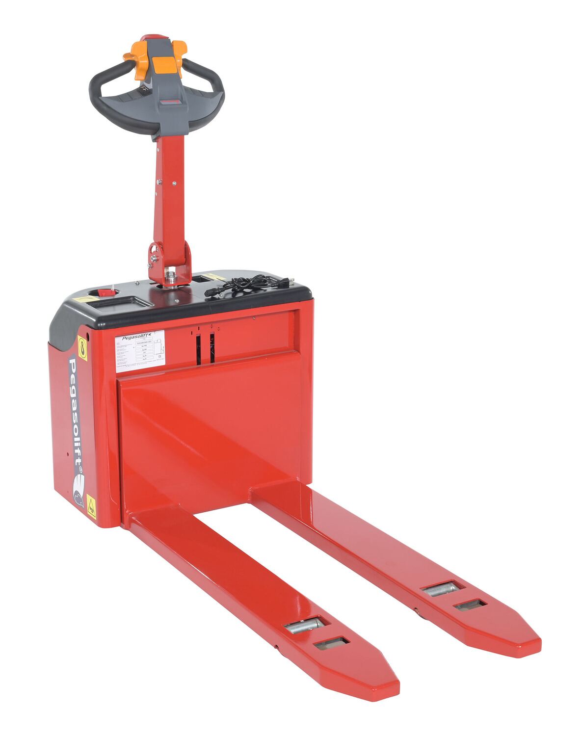 Steel Pegasolift Electric Pallet Truck 20 In. x 45 In. 3,500 Lb. Capacity RedThis electric pallet truck provides an always dependable performance in and around the workplace. With a maintenance friendly design, general upkeep is simple to perform. This style is excellent for confined spaces such as elevators, trailers, containers and narrow aisles. An LCD hour indicator is just one of the many features included in this design. Other features include an ergonomic control head with raise-lower buttons, horn, turtle speed button and forward-reverse butterfly knobs.