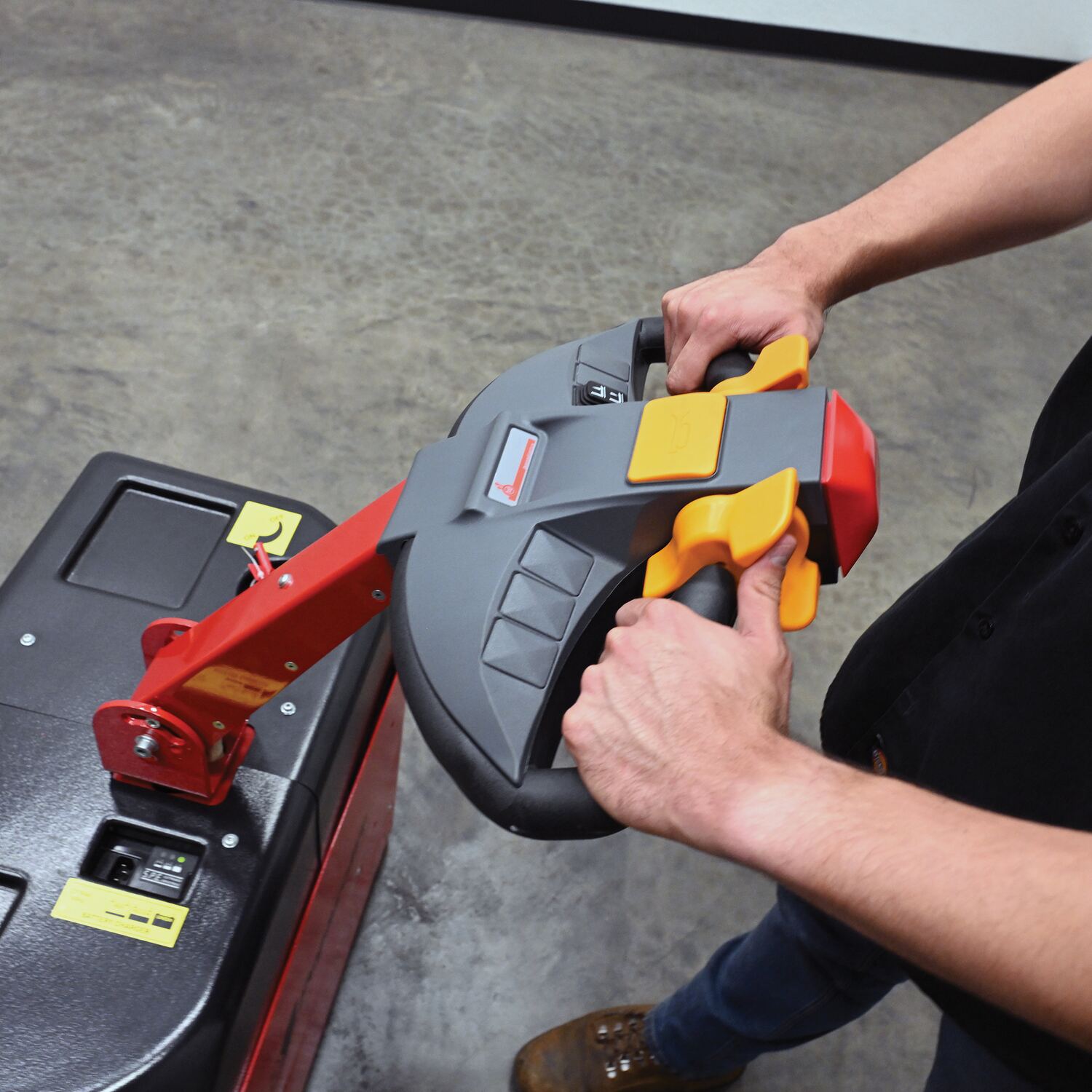 This electric pallet truck provides an always dependable performance in and around the workplace. With a maintenance friendly design, general upkeep is simple to perform. This style is excellent for confined spaces such as elevators, trailers, containers and narrow aisles. An LCD hour indicator is just one of the many features included in this design. Other features include an ergonomic control head with raise-lower buttons, horn, turtle speed button and forward-reverse butterfly knobs.