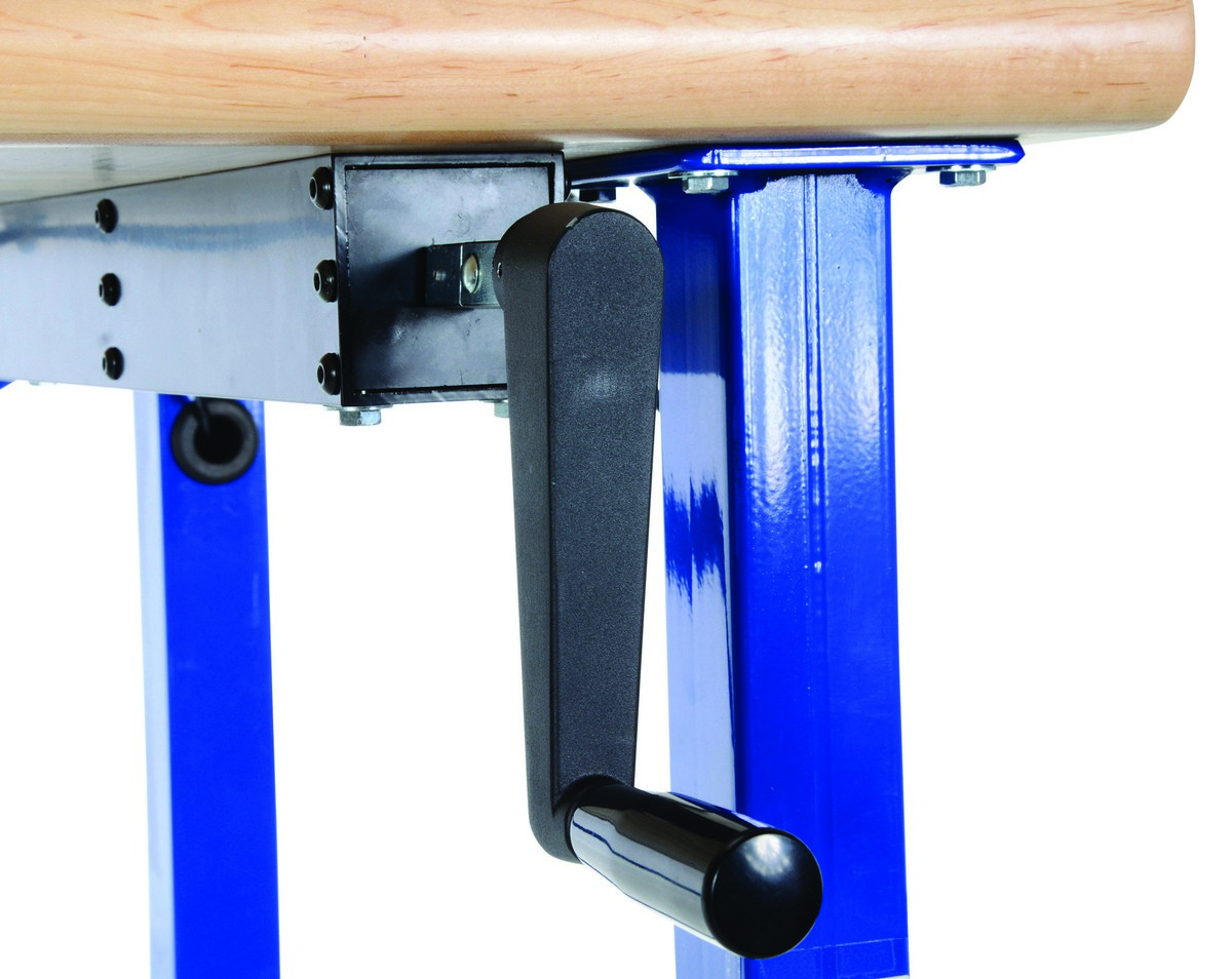 Steel/Wood Manual Adjustable Ergonomic Work Bench 60 In. x 30 In. 750 Lb. Capacity Blue/TanThe manual adjustable Ergonomic Work Bench raises material to an ergonomic working height. A fold away hand crank is located directly under the platform for easy raising and lowering. The hydraulic system will raise platform evenly.