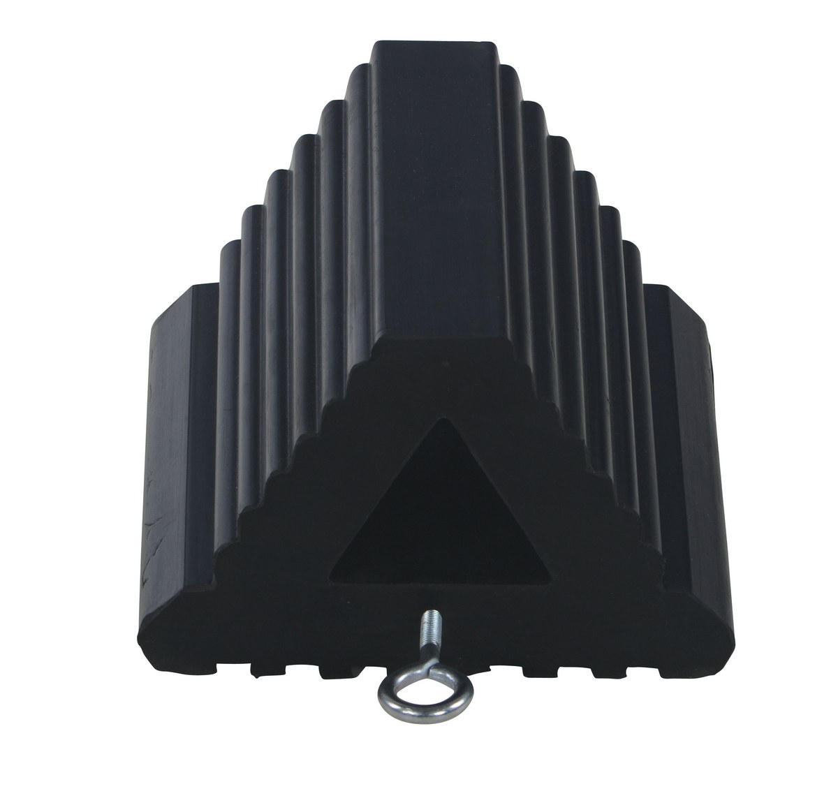 Extruded Rubber Wheel Chock 8-1/2 In. x 8-1/2 In. x 6 In. BlackThe rubber Wheel Chock is constructed of reinforced rubber to provide a sure grip on virtually any surface. The curved surface contours to fit tires. Rubber resists tearing, abrasion, ozone weathering, etc. The functional design is durable in all weather conditions.