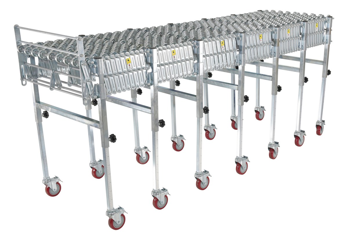 Steel Expandable Conveyor Skate 200 Lb. Capacity SilverExpandable roller conveyor is the perfect asset for packaging and distributing facilities. The conveyor provides the user an ergonomically friendly way to transfer goods while minimizing the bending and twisting during shipping and handling. A strong construction provides strength for transferring large awkward products. The conveyor can be expanded to reach greater distances between packaging points. Once finished it can be retracted to fit in a condensed area.