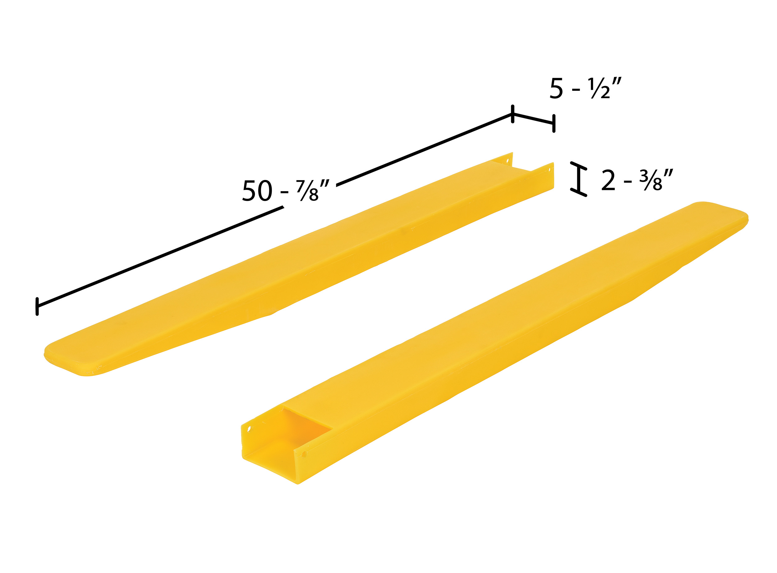 Polyethylene Fork Blade Protectors 5 In. x 48 In. YellowThe fork blade protectors are a great addition to the fork truck forks used in a variety of facilities. The unit is designed of a polyethylene construction for lightweight transference from workstation to workstation. The bright color enhances visibility for the user as well as other personnel in the work area. A simple installation onto the fork can have the protector in place and ready for immediate use. Fork blade protectors are sold in pairs.
