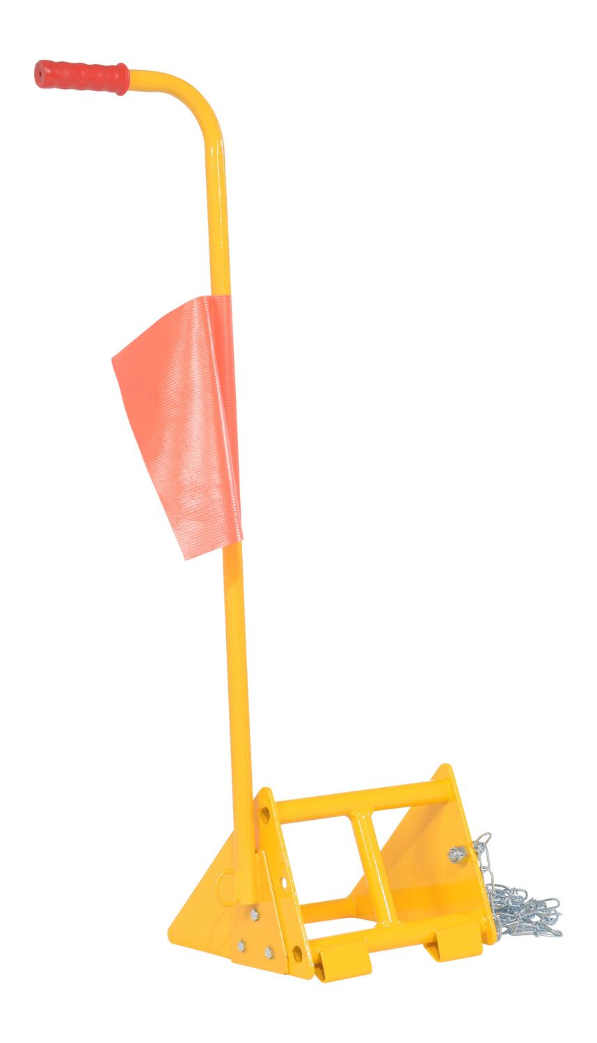 Fabricated Steel Wheel Chock With Ergonomic Handle and Flag YellowThe fabricated ergo-handle Wheel Chock has an ergonomic design that makes it easy to move wheel chocks in and out of position under trailer wheels. It reduces the risk of back, knee, and foot injuries. The handle is constructed of steel and includes a yellow powder coat finish. D-ring provided for attaching security chain. A vinyl flag is included to provide added visibility and awareness to the chock. Assembly required.