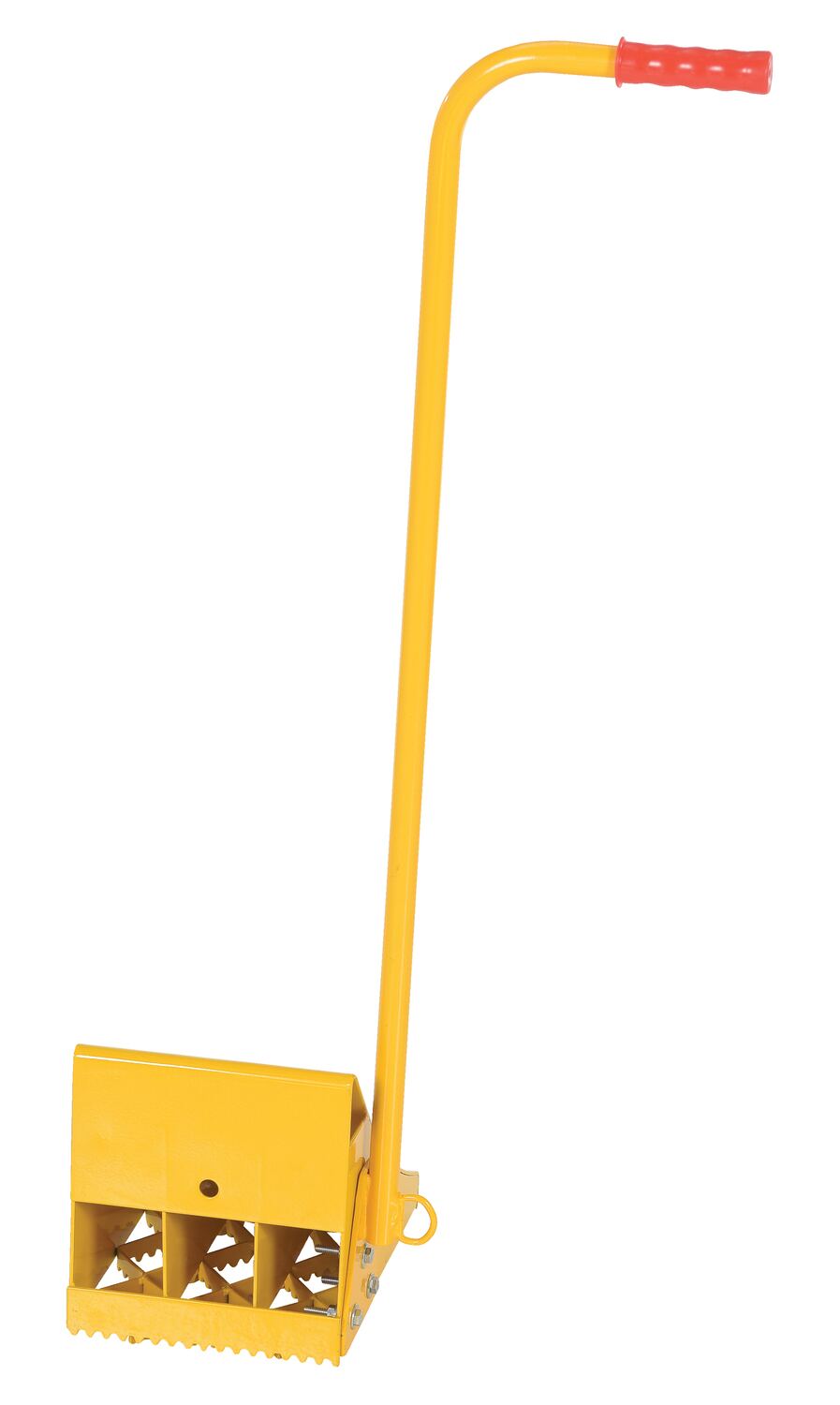 The fabricated ergo-handle Wheel Chock has an ergonomically design that makes it easy to move wheel chocks in and out of position under trailer wheels. It reduces the risk of back, knee, and foot injuries. The handle is constructed of steel and includes a yellow powder coat finish. Assembly required. D-ring provided for attaching security chain. Chain not included.